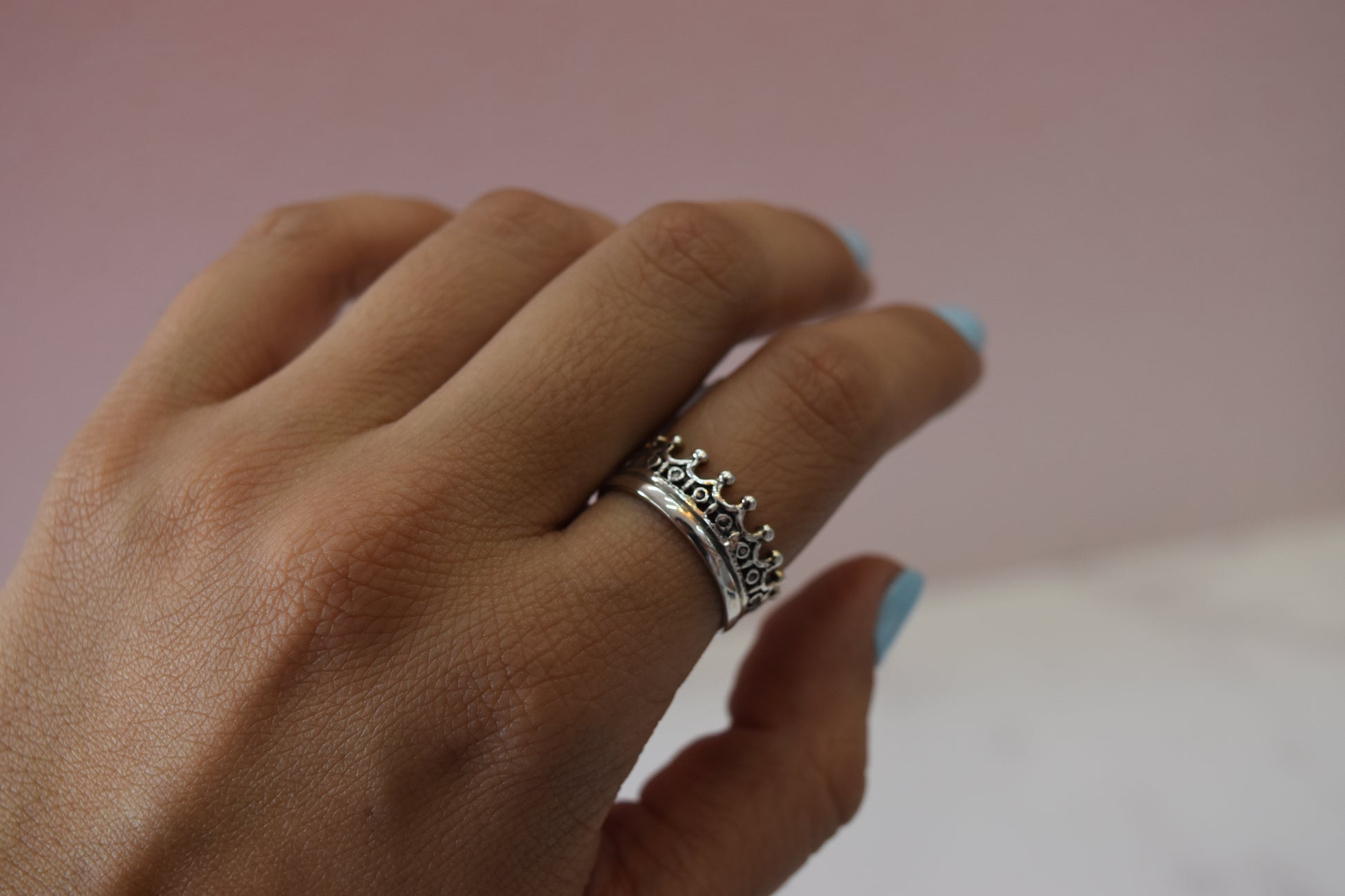 Un anillo elegante tipo argolla con diseño de corona y acabado oxidado vintage. Perfecto para quienes buscan realeza con carácter único.