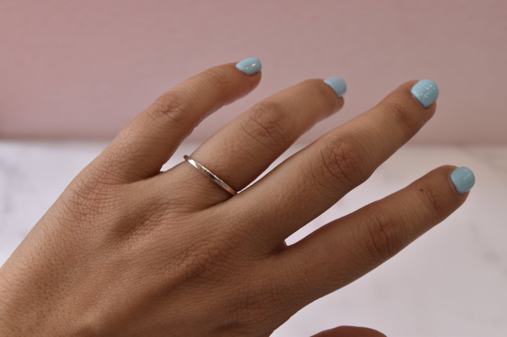 Un anillo elegante tipo argolla delgada con acabado escarchado. Perfecto para quienes buscan brillo sutil con comodidad de uso diario.