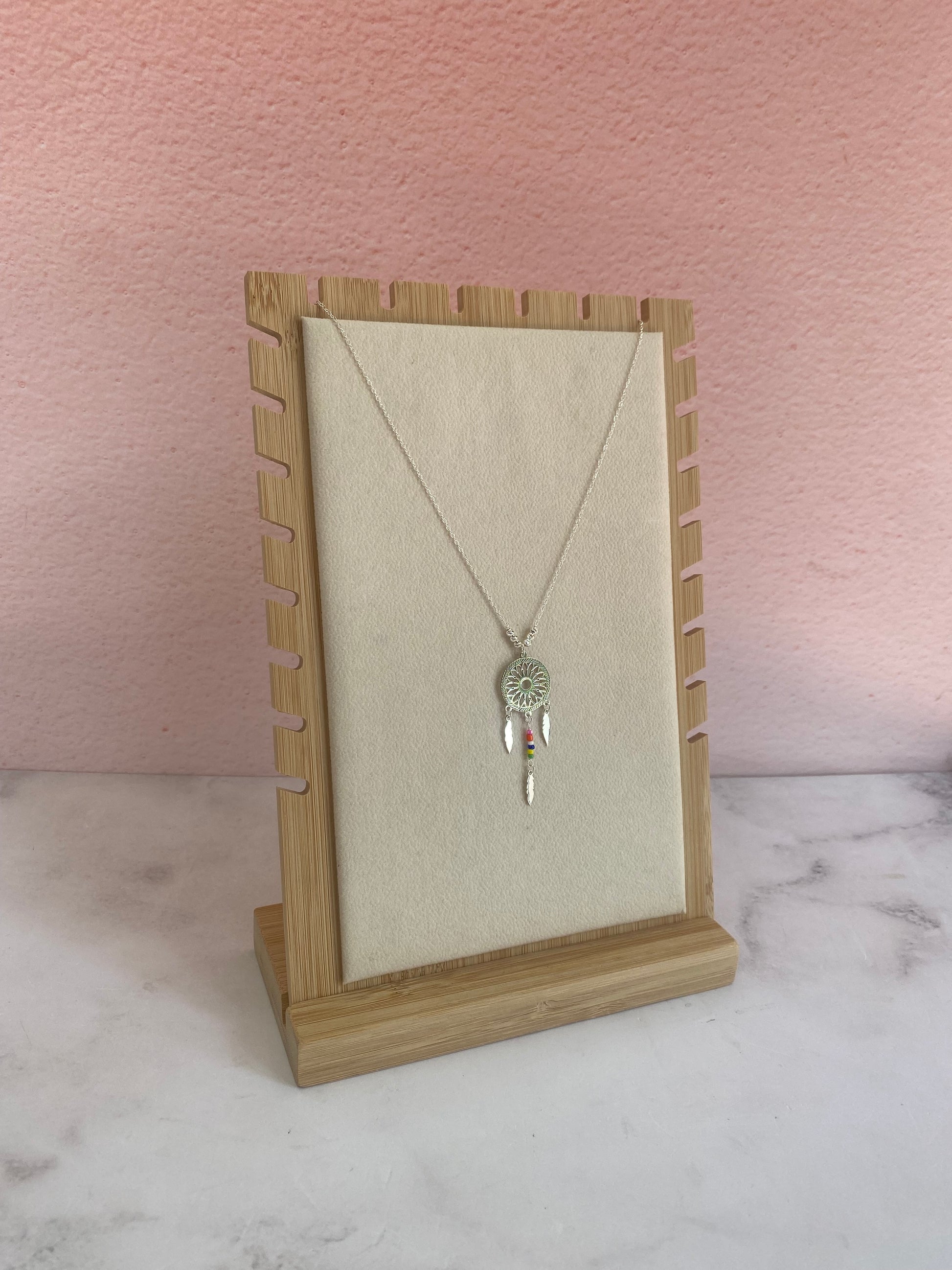 Un collar mágico que combina la protección del atrapasueños con la energía de cuentas coloridas. En plata .925, representa sueños dulces, protección nocturna y la alegría de soñar en colores.