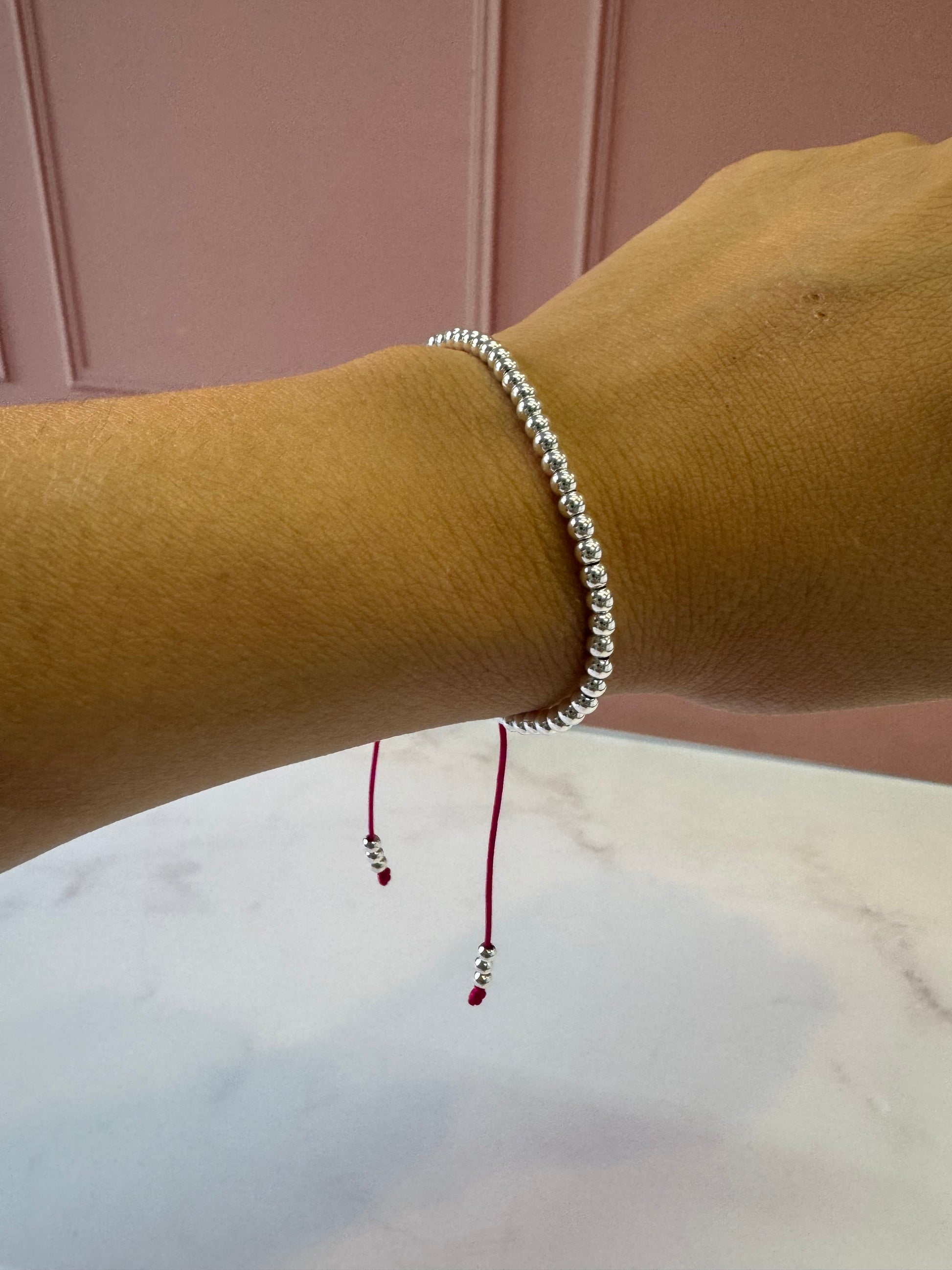 Una pulsera vibrante tejida en hilo chino fucsia con bolitas de plata .925. Perfecta para quienes buscan energía alegre y pasión con color intenso.