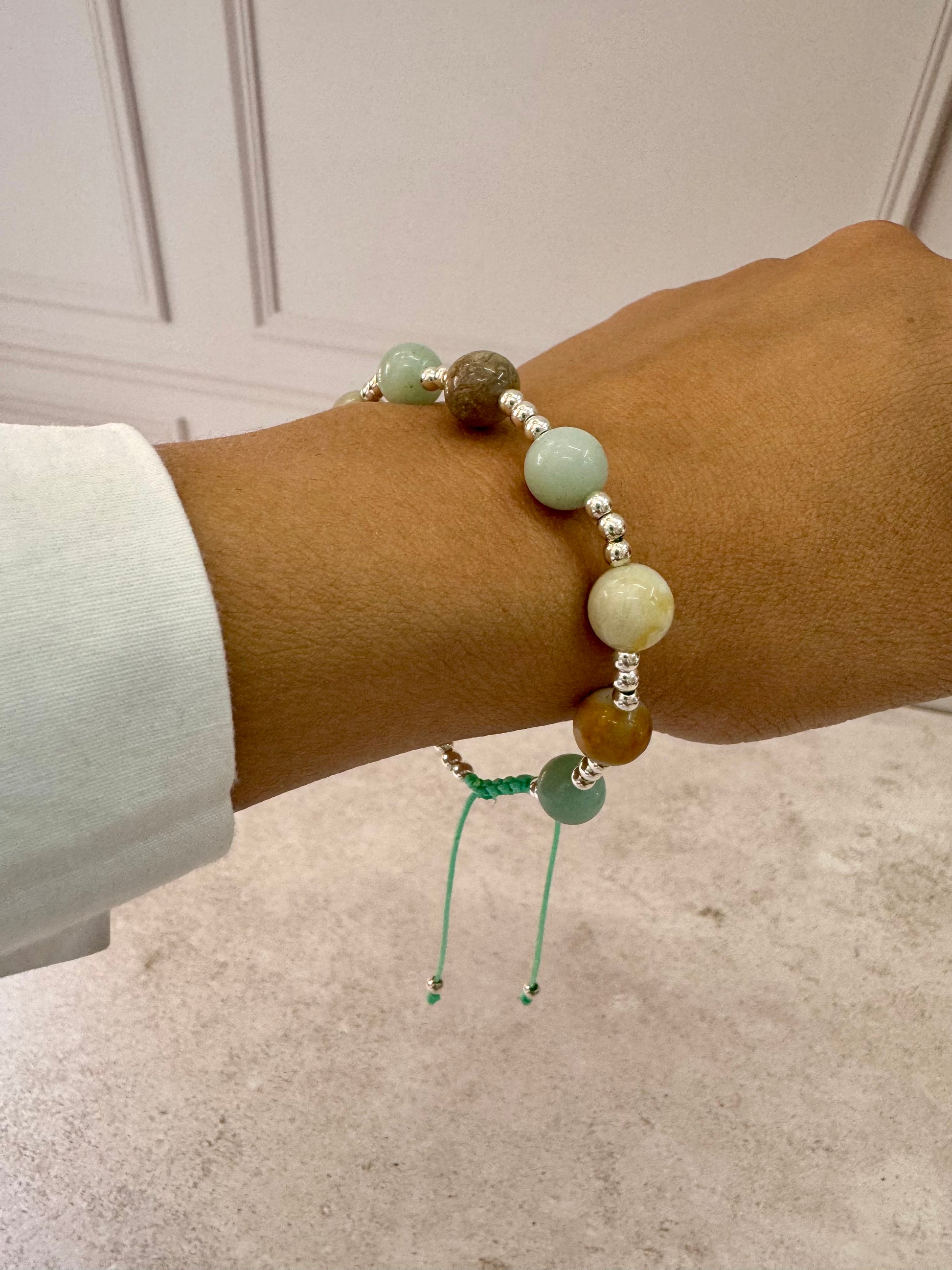 Pulsera tejida en hilo chino con bolitas de plata.925 y piedra natural