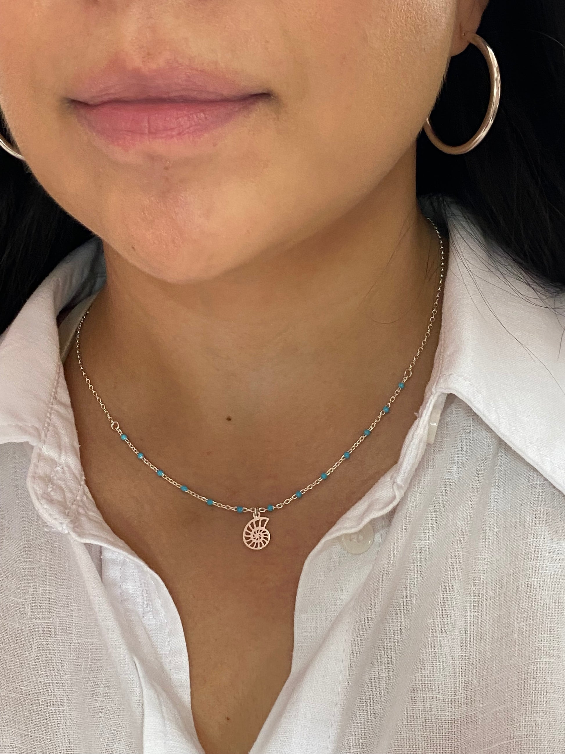 Un collar que celebra la belleza del océano con caracol y cuentas de turquesa. En plata .925, representa protección marina, sabiduría ancestral y conexión con el mar.