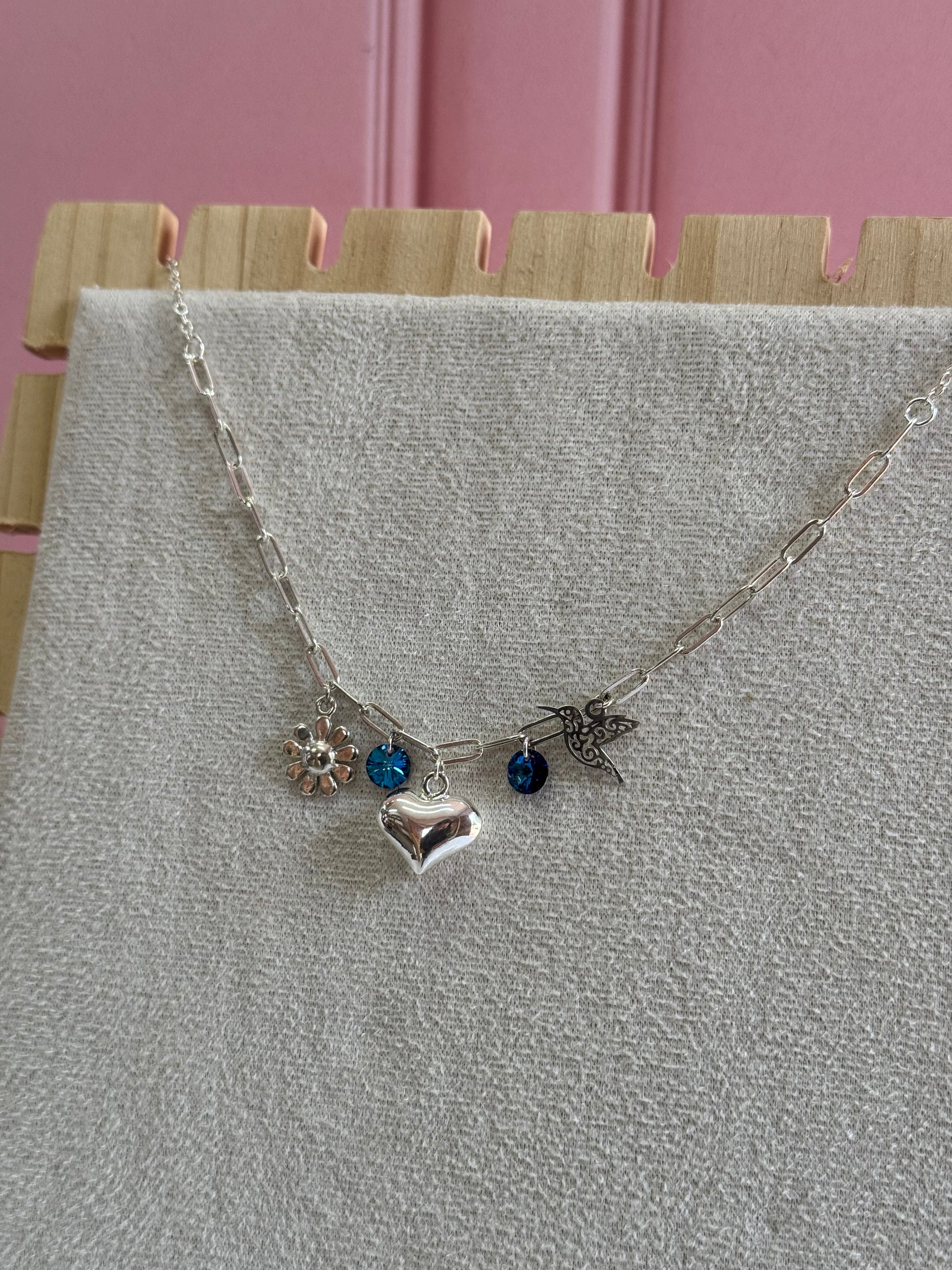Un collar encantador que combina la energía del colibrí con la pureza de la margarita. En plata .925 con cristales Swarovski, representa alegría, inocencia y la belleza de encontrar dulzura en la vida.