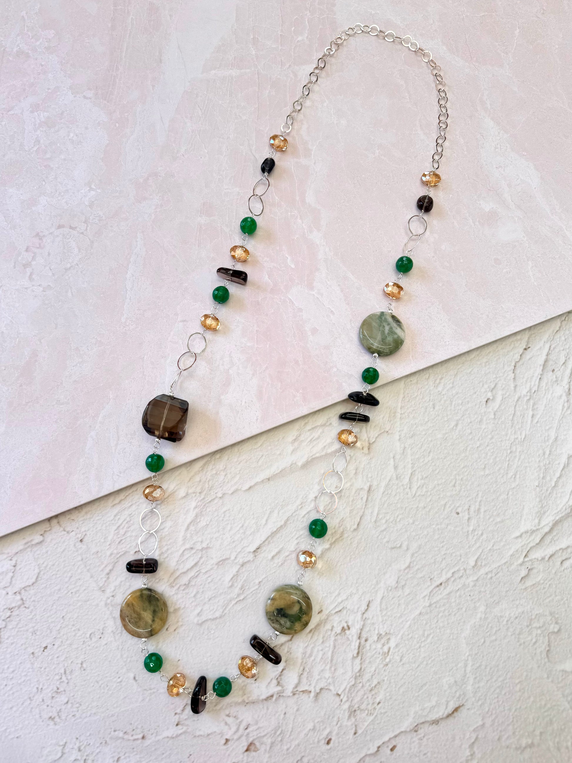 Un collar largo hermoso con piedras naturales en tonos otoñales. Perfecto para quienes buscan calidez y transformación con estilo bohemio.