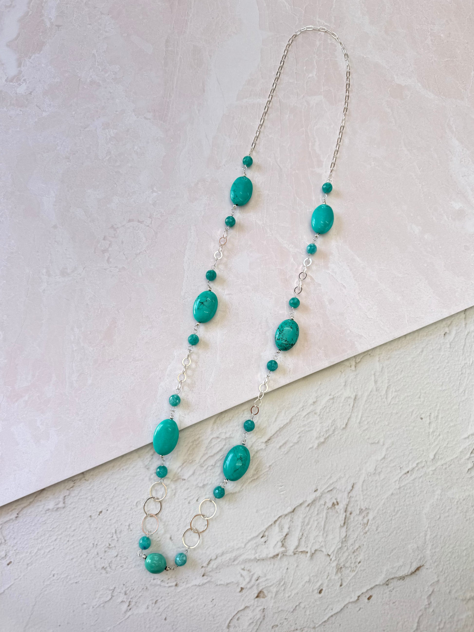Un collar largo hermoso con turquesas naturales. Perfecto para quienes buscan protección y conexión con estilo bohemio.