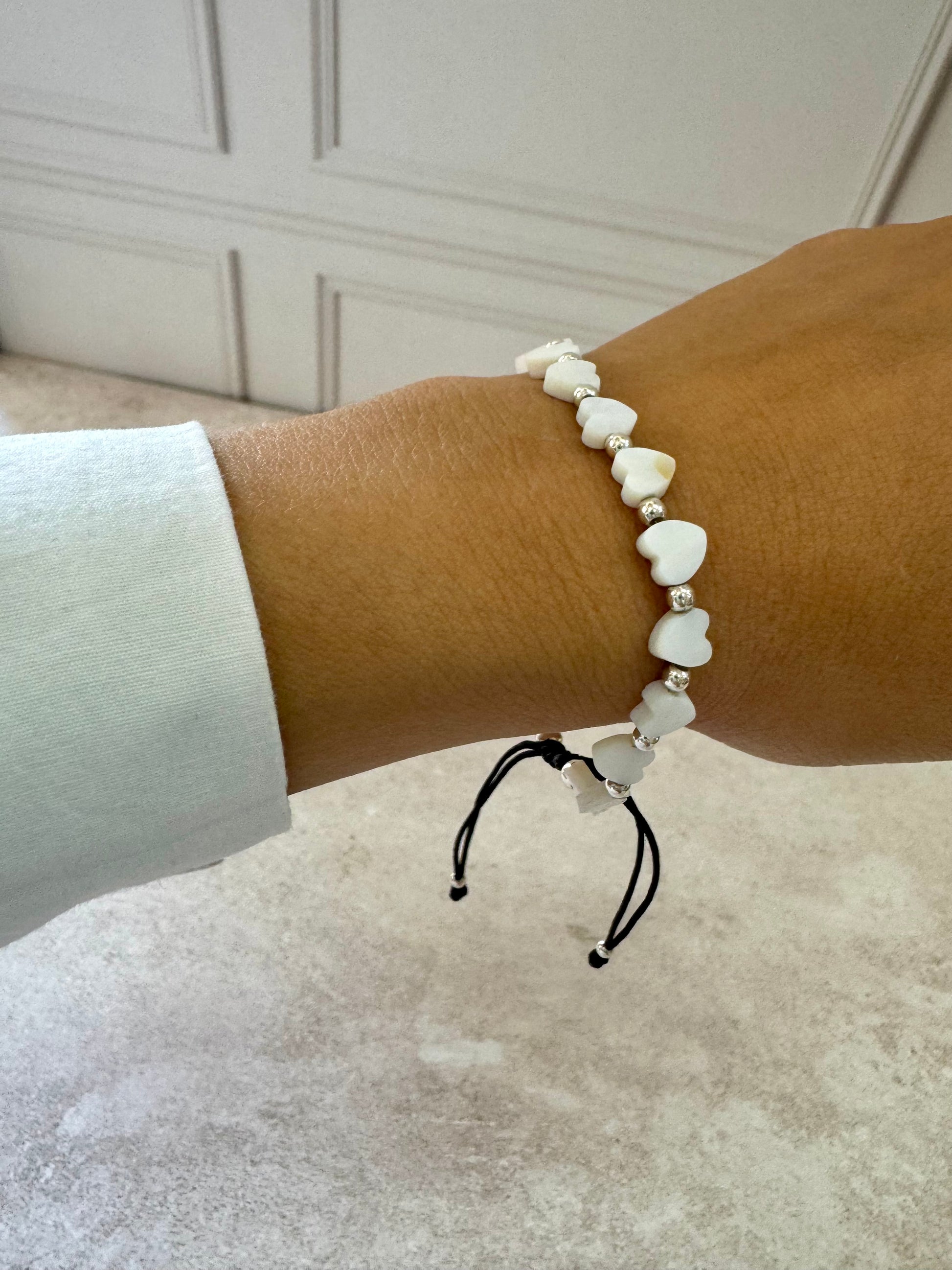 Pulsera tejida en hilo chino con bolitas de plata.925 y concha