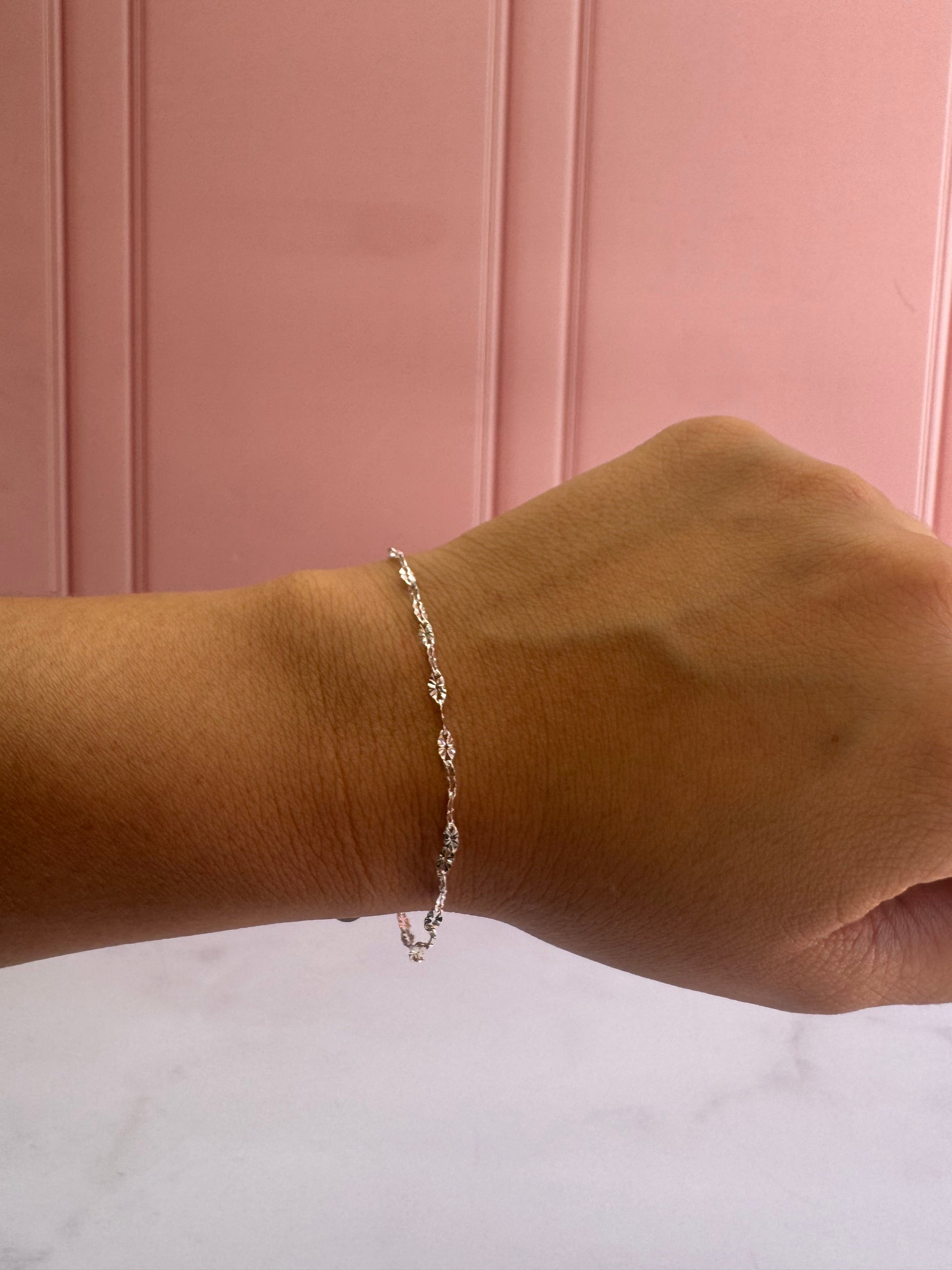 El acabado diamantado multiplica el brillo, haciendo que la pulsera capture la luz desde todos los ángulos. Es ultra ligera pero llena de presencia brillante.