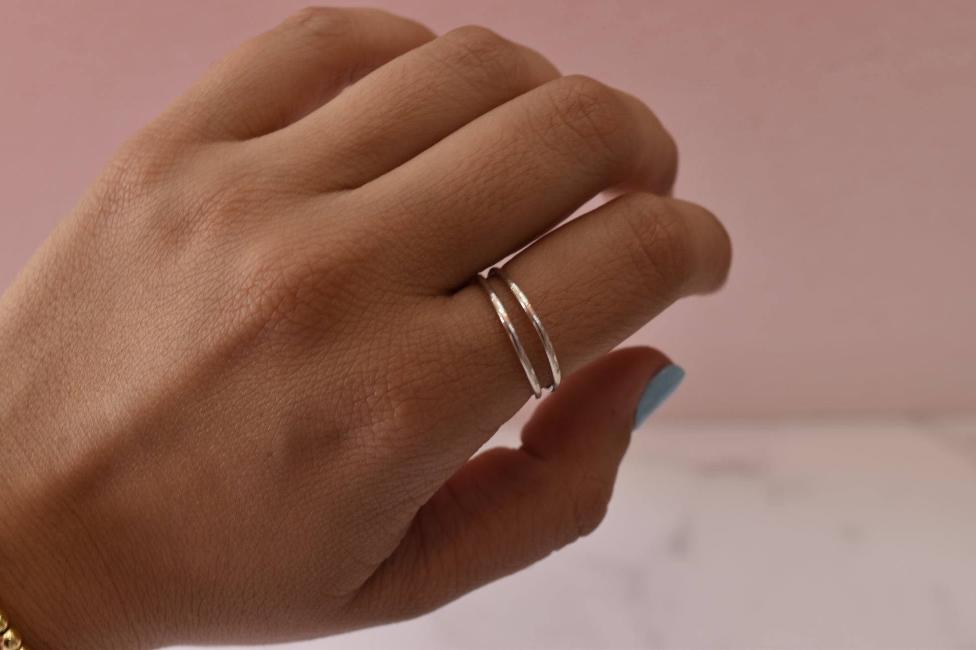Un anillo elegante con diseño de doble argolla que crea un efecto sofisticado y moderno. Perfecto para quienes buscan un estilo minimalista.