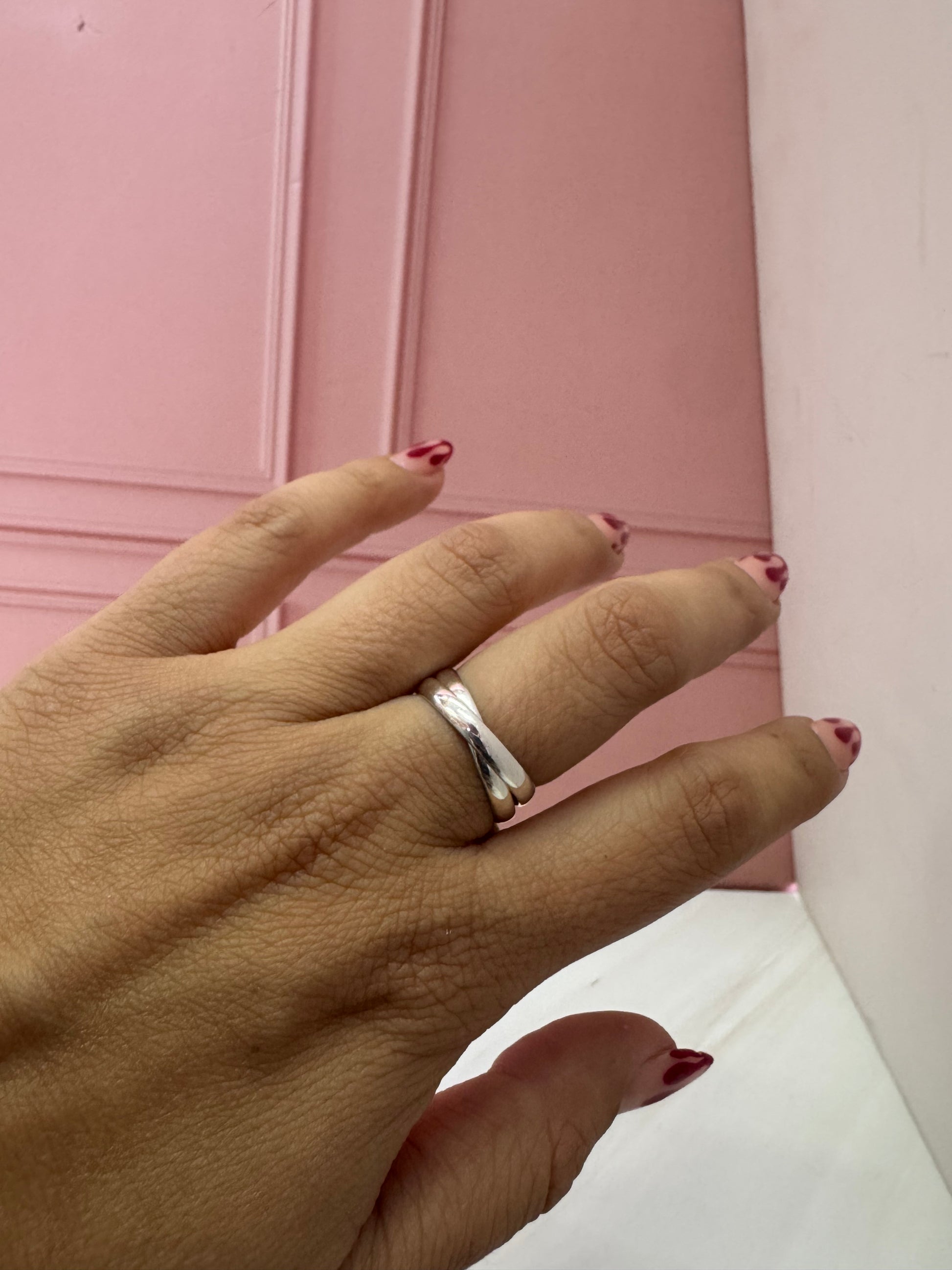 Un anillo chunky con dos argollas que se cruzan creando conexión visual. En plata .925, representa lazos entrelazados, dualidad unida y la belleza de dos fuerzas que se encuentran con presencia elegante.