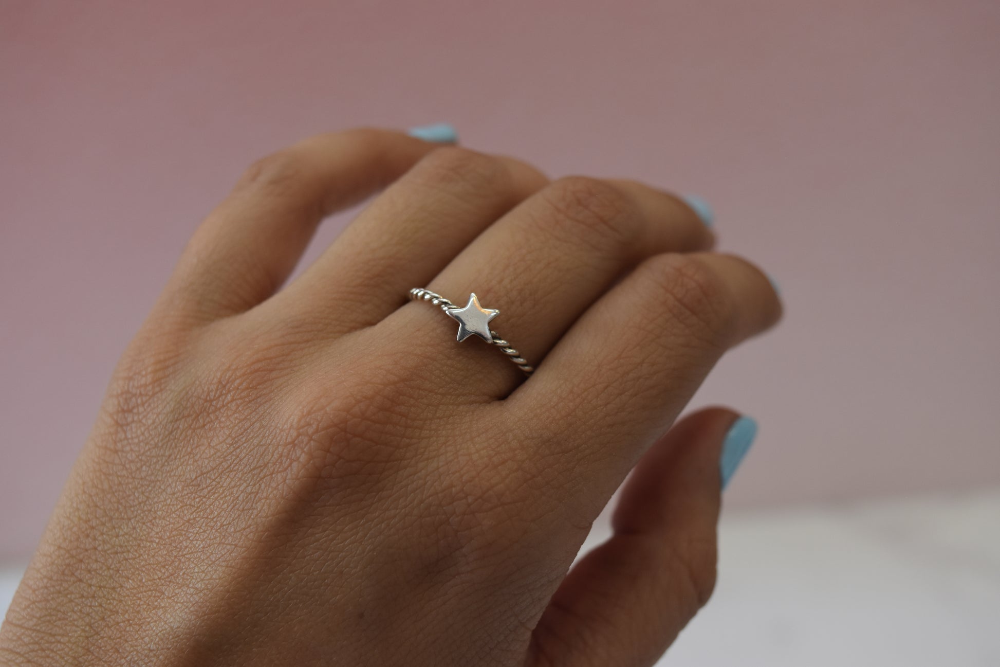 Un anillo encantador con diseño de estrella combinado con torzal y acabado oxidado. Perfecto para quienes buscan brillar con textura vintage.