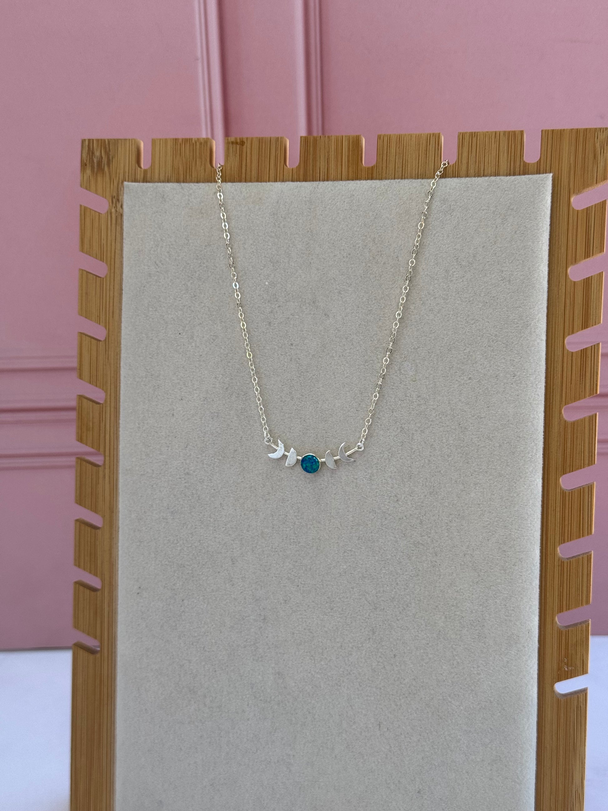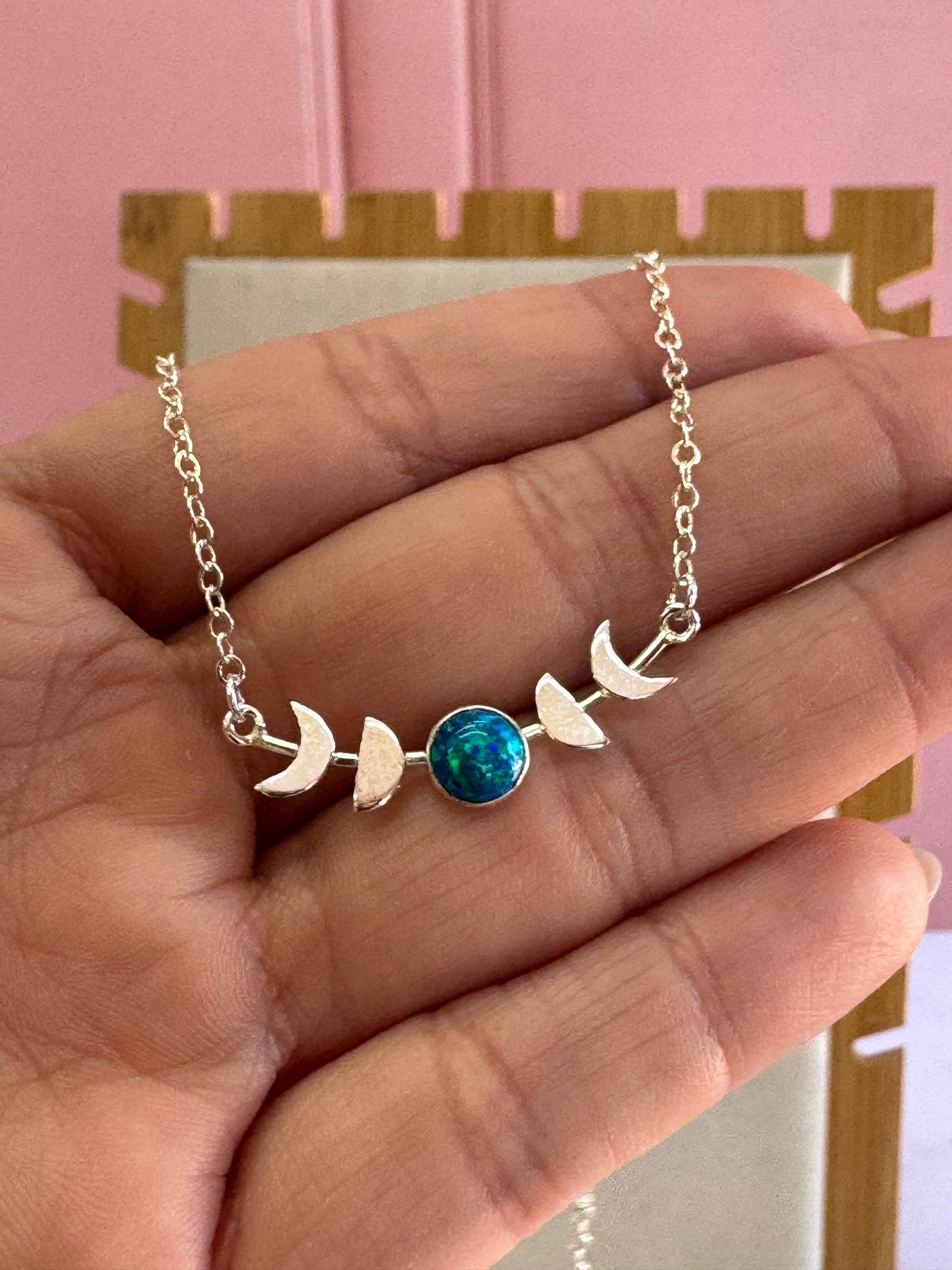 Un collar celestial que celebra los ciclos de la luna con la magia del ópalo. Las fases lunares en plata .925 con ópalo natural representan transformación, intuición y conexión con los ritmos naturales.