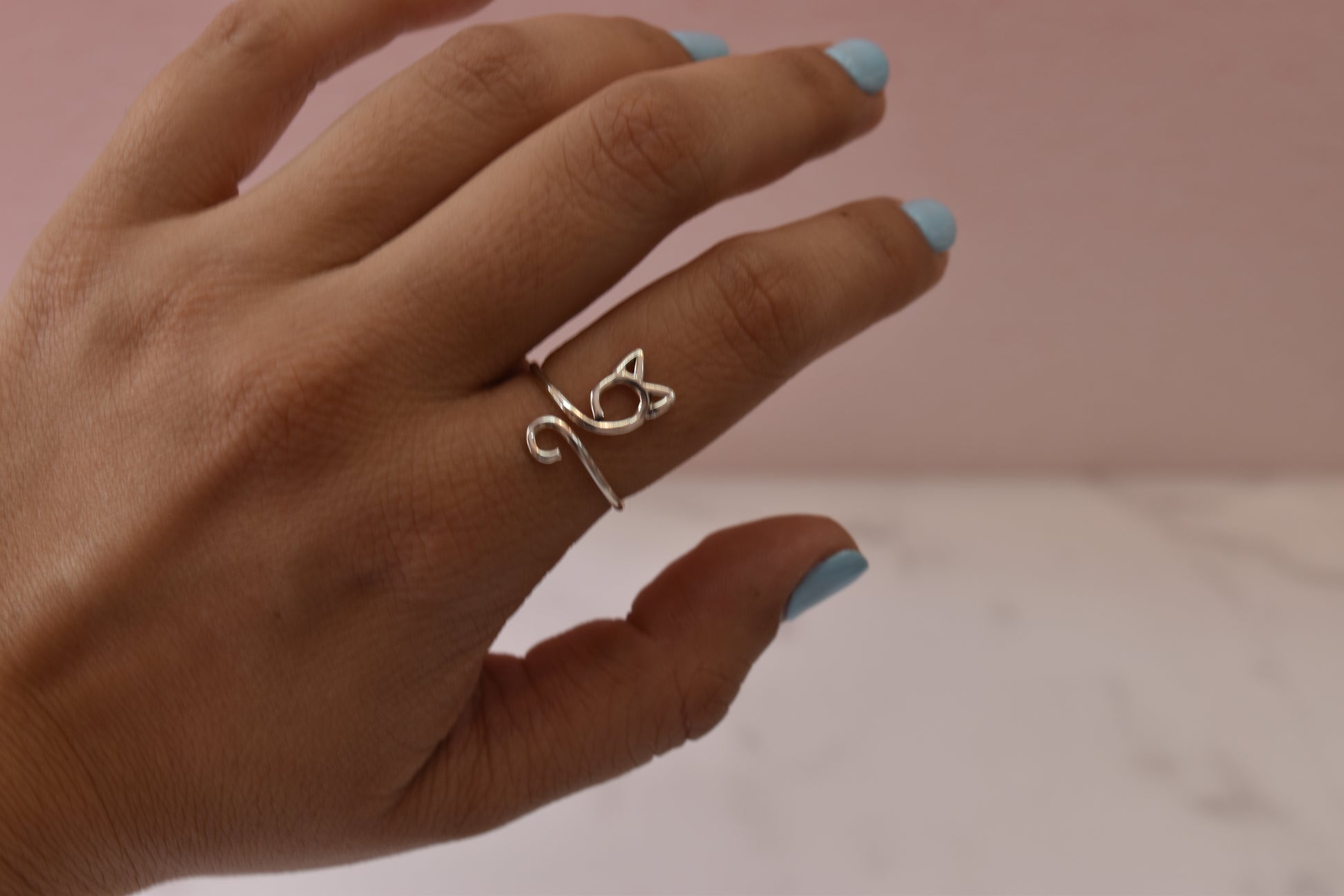 Un anillo encantador con diseño de gatito en contorno ajustable. Perfecto para amantes de los gatos que buscan elegancia felina con ajuste perfecto.