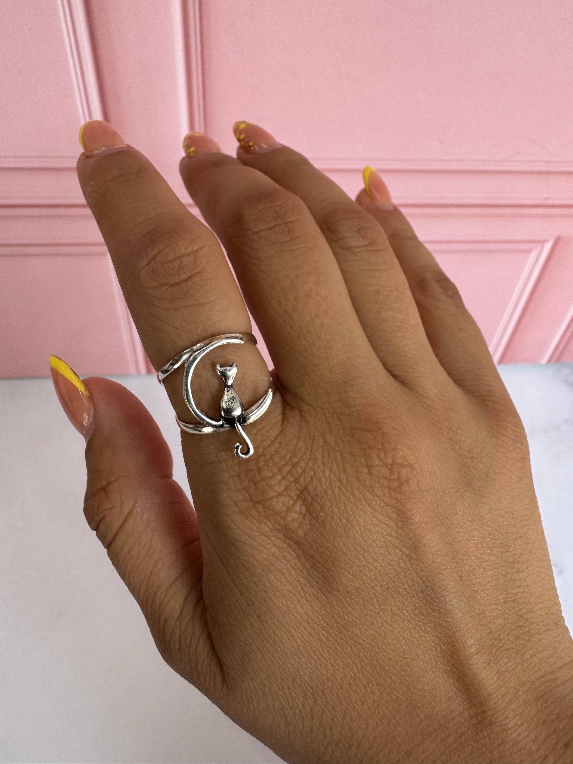 Un anillo encantador con diseño de gato en la luna y acabado oxidado. Perfecto para amantes de los gatos que buscan un estilo místico vintage.