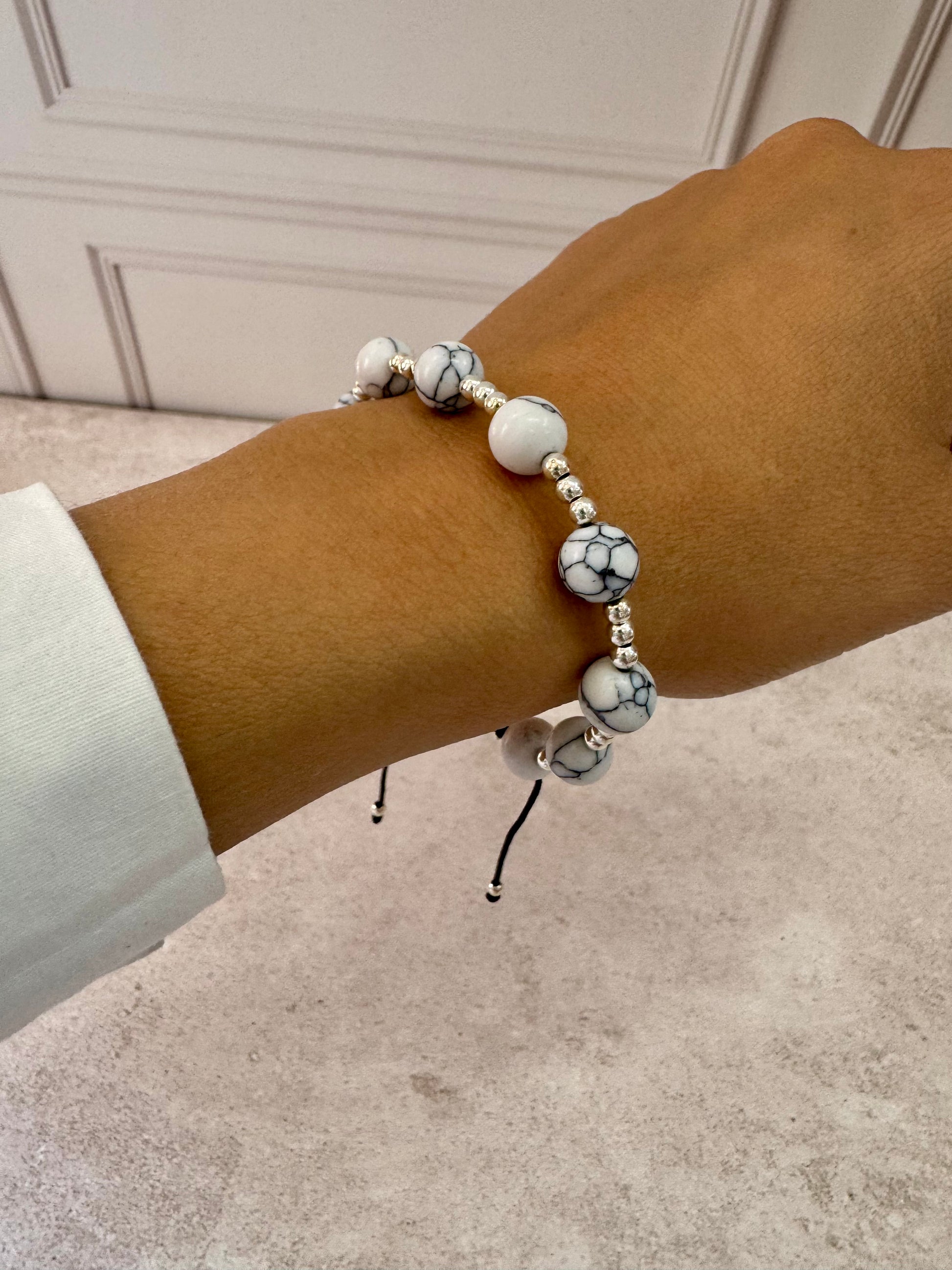 Pulsera tejida en hilo chino con bolitas de plata.925 y piedra natural