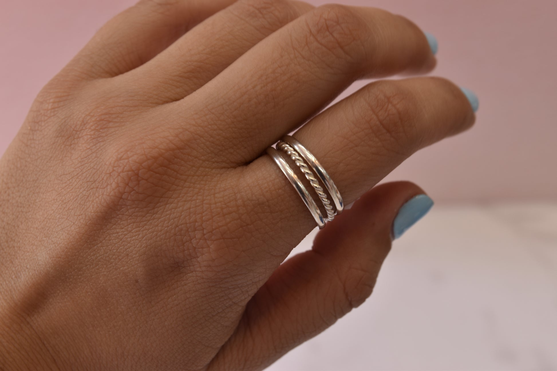 Un anillo elegante con diseño de triple banda: liso, torzal y liso. Perfecto para quienes buscan contraste de texturas con elegancia.