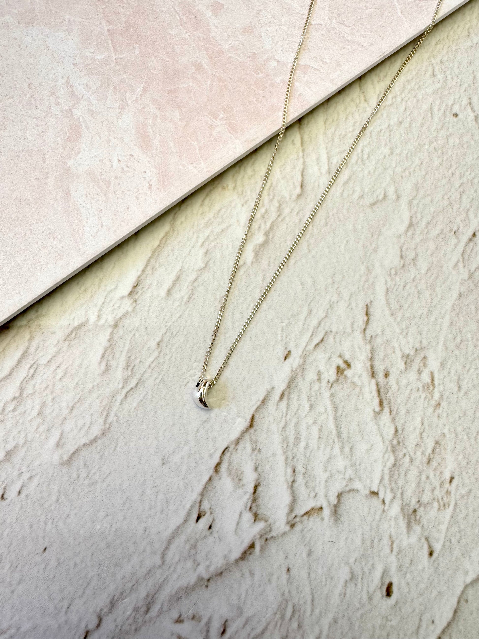 Un collar minimalista que captura la magia de la luna. Esta lunita bombeada en plata .925 representa intuición femenina, ciclos naturales y la belleza de la luz nocturna con elegancia sutil.