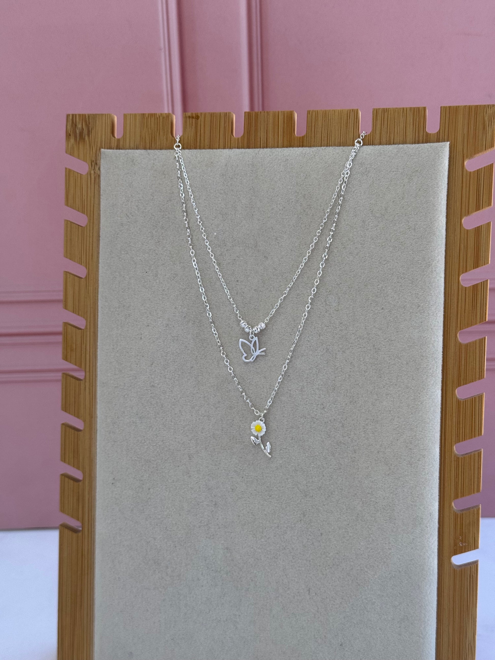 Un collar doble elegante con mariposa y flor en plata .925 y resina. Perfecto para quienes buscan transformación y belleza natural con color especial.
