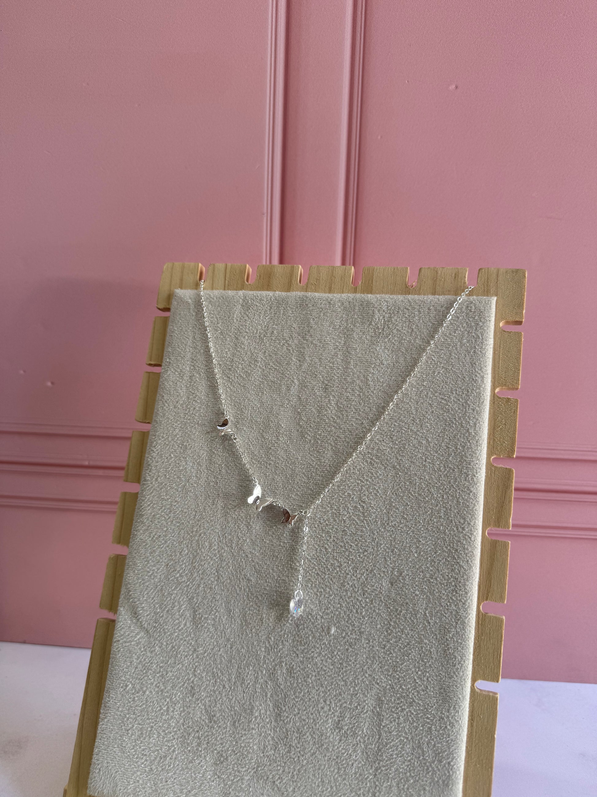 Un collar que celebra la transformación en tres etapas con el brillo premium de Swarovski. Tres mariposas en plata .925 con cristales Swarovski representan evolución continua, libertad y belleza en movimiento.