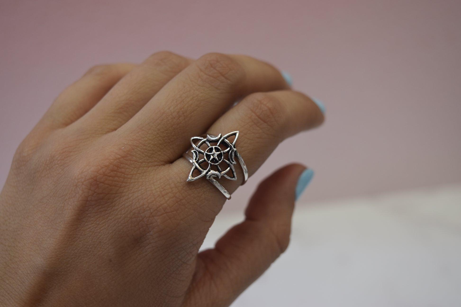 Un anillo místico con diseño de nudo de bruja y doble lunas con acabado oxidado. Perfecto para quienes buscan protección mágica y conexión lunar.