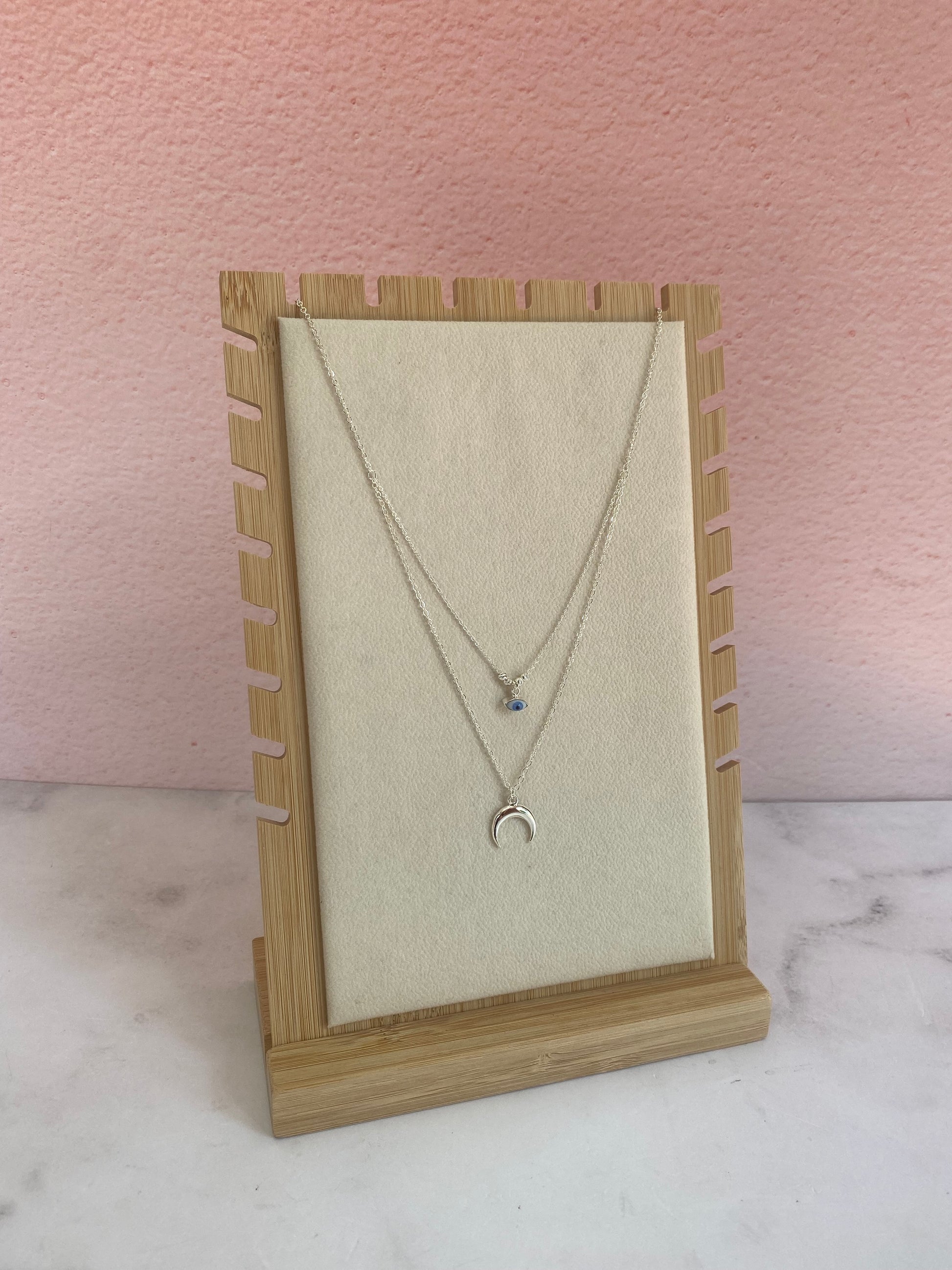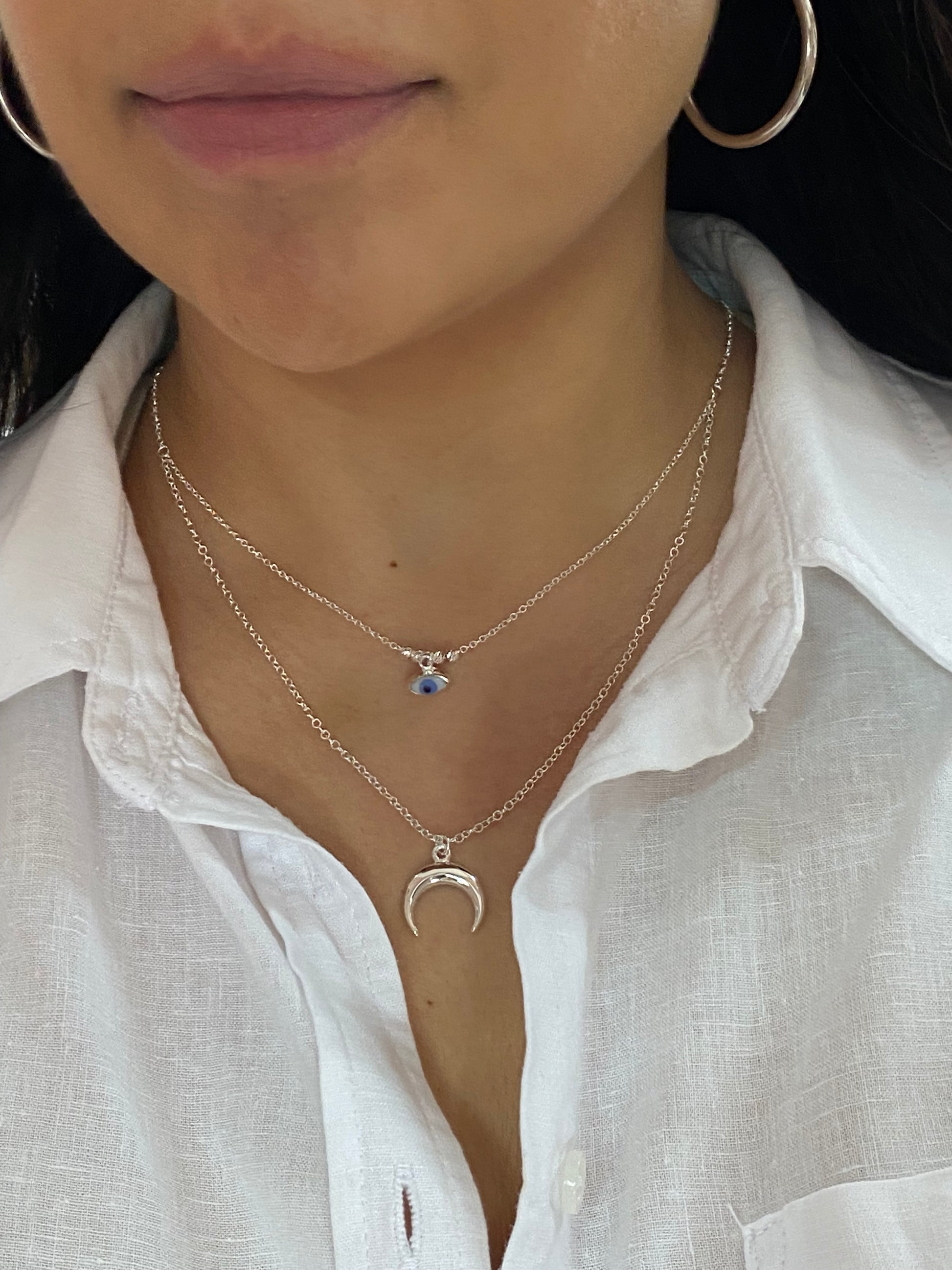 Un collar triple que combina la protección del ojo turco con la magia de la luna invertida. En plata .925, representa protección contra el mal de ojo, intuición lunar y conexión con los ciclos nocturnos.