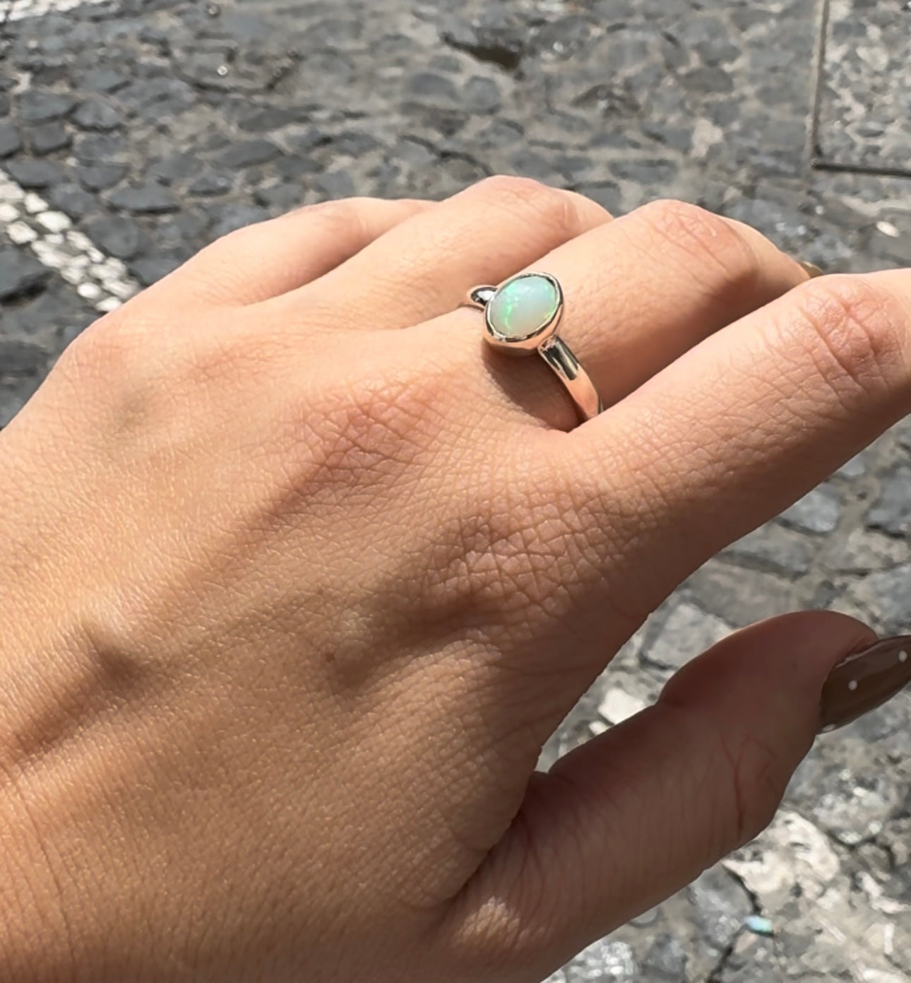 Un anillo elegante con ópalo natural montado en bisel que crea un efecto moderno y sofisticado. Perfecto para quienes buscan una piedra única con diseño contemporáneo.