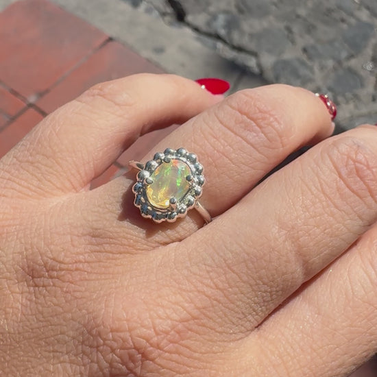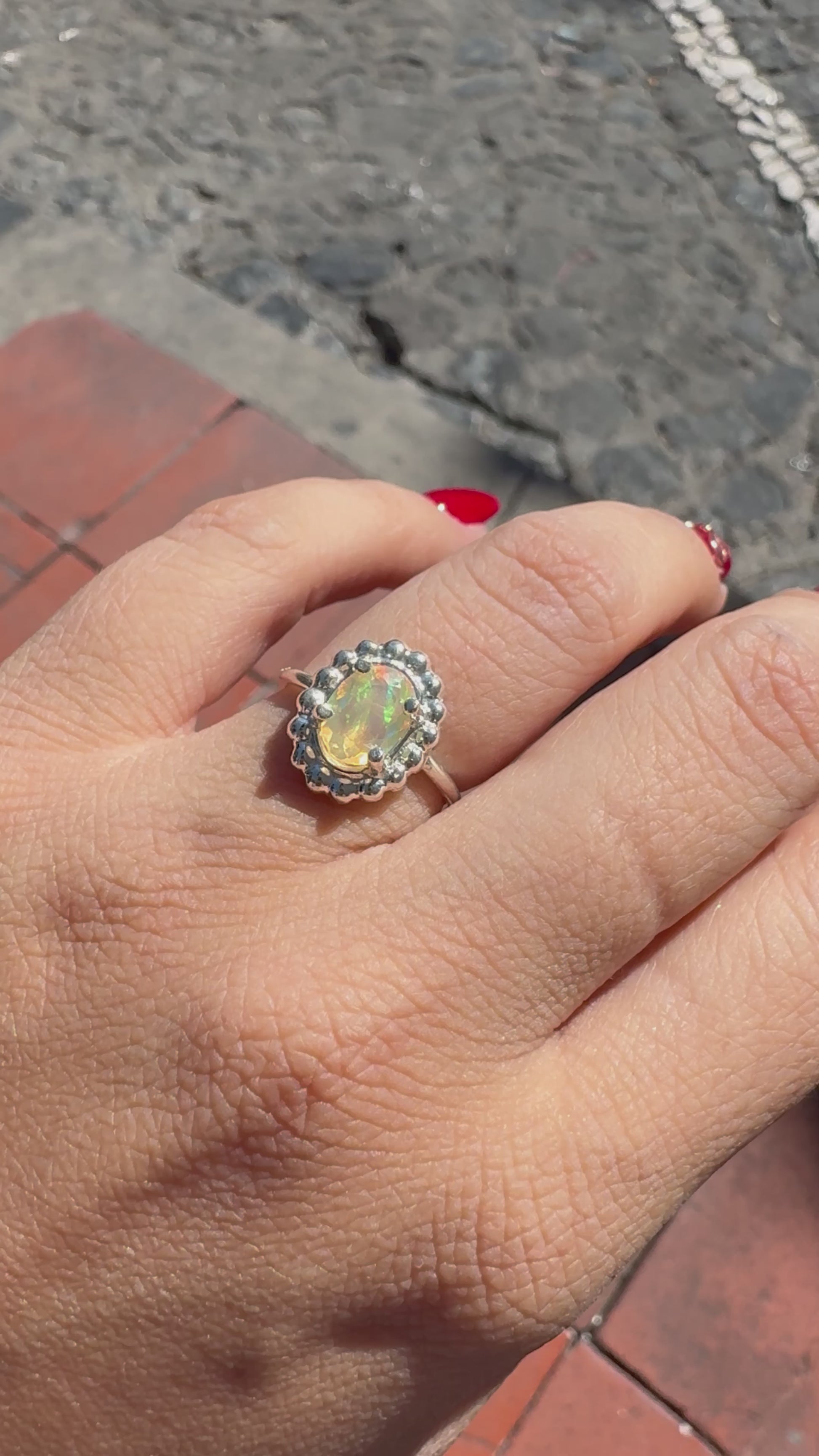 Un anillo elegante con ópalo de fuego milky que crea un efecto lechoso y misterioso. Perfecto para quienes buscan una piedra única con tonos suaves.