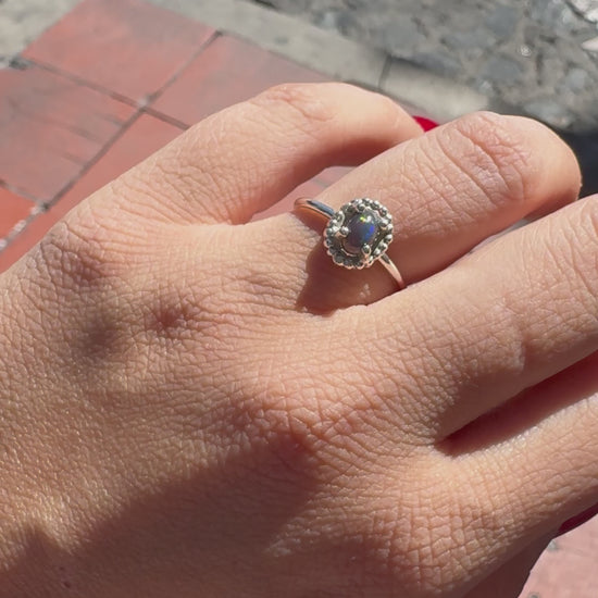 El ópalo negro es hipnotizante con su juego de colores sobre fondo oscuro. El diseño de flor le da un toque femenino y elegante.