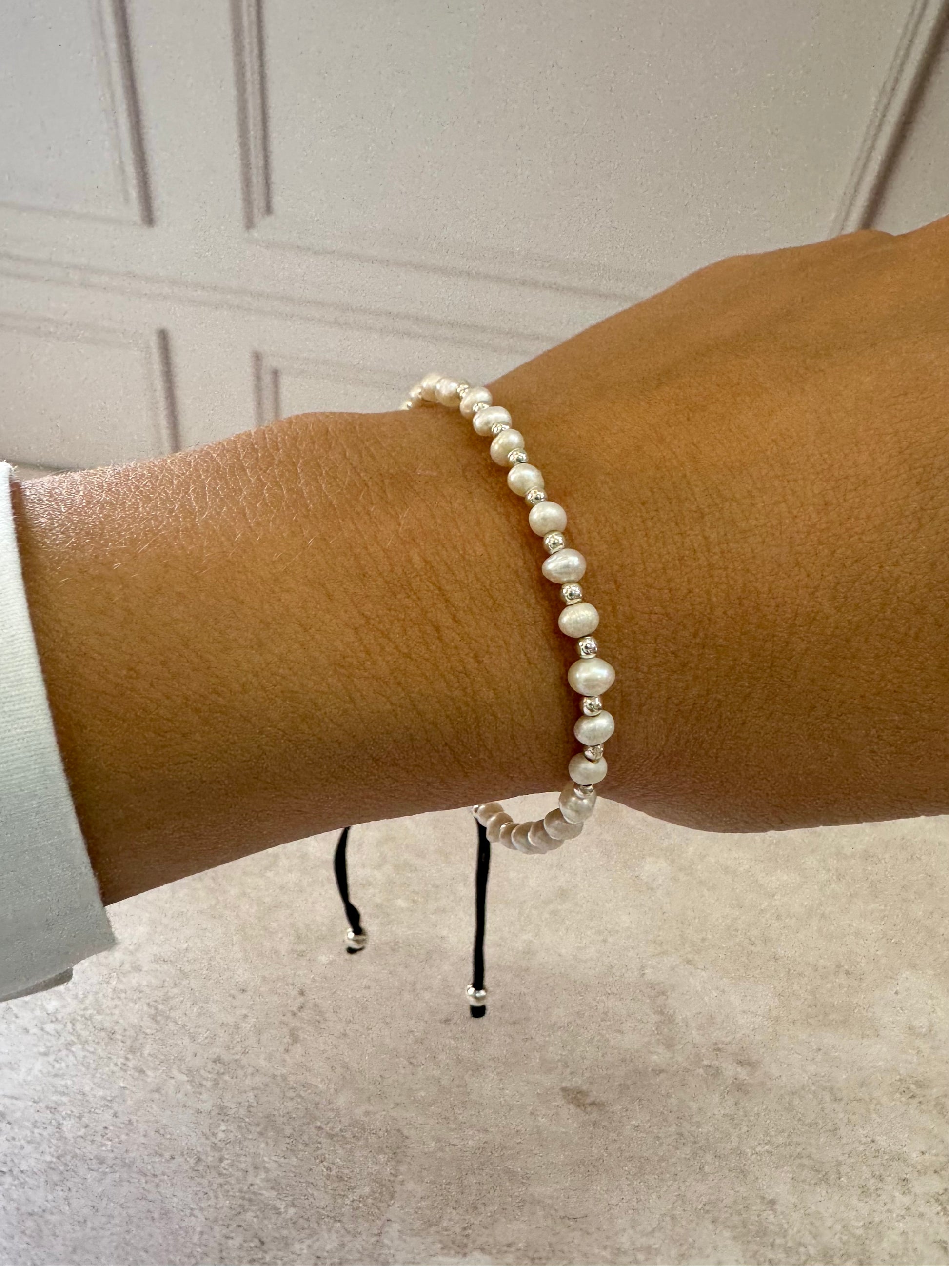 Una pulsera delicada tejida en hilo chino con bolitas de plata .925 y perla de río natural. Perfecta para quienes buscan elegancia natural con estilo bohemio.