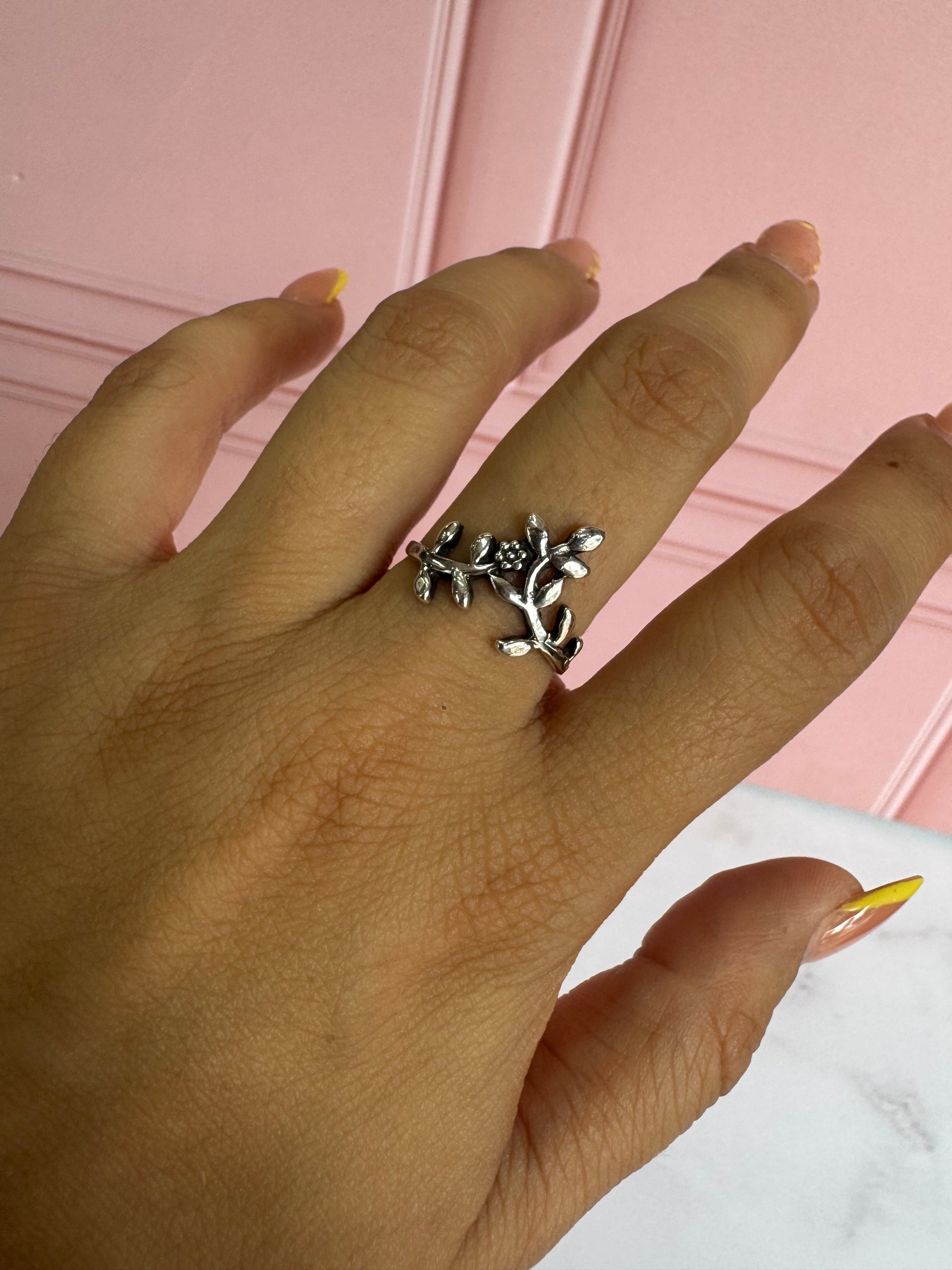 Un anillo elegante con diseño de ramas y flores con acabado oxidado que crea un efecto natural y vintage. Perfecto para quienes aman la naturaleza y el estilo bohemio.
