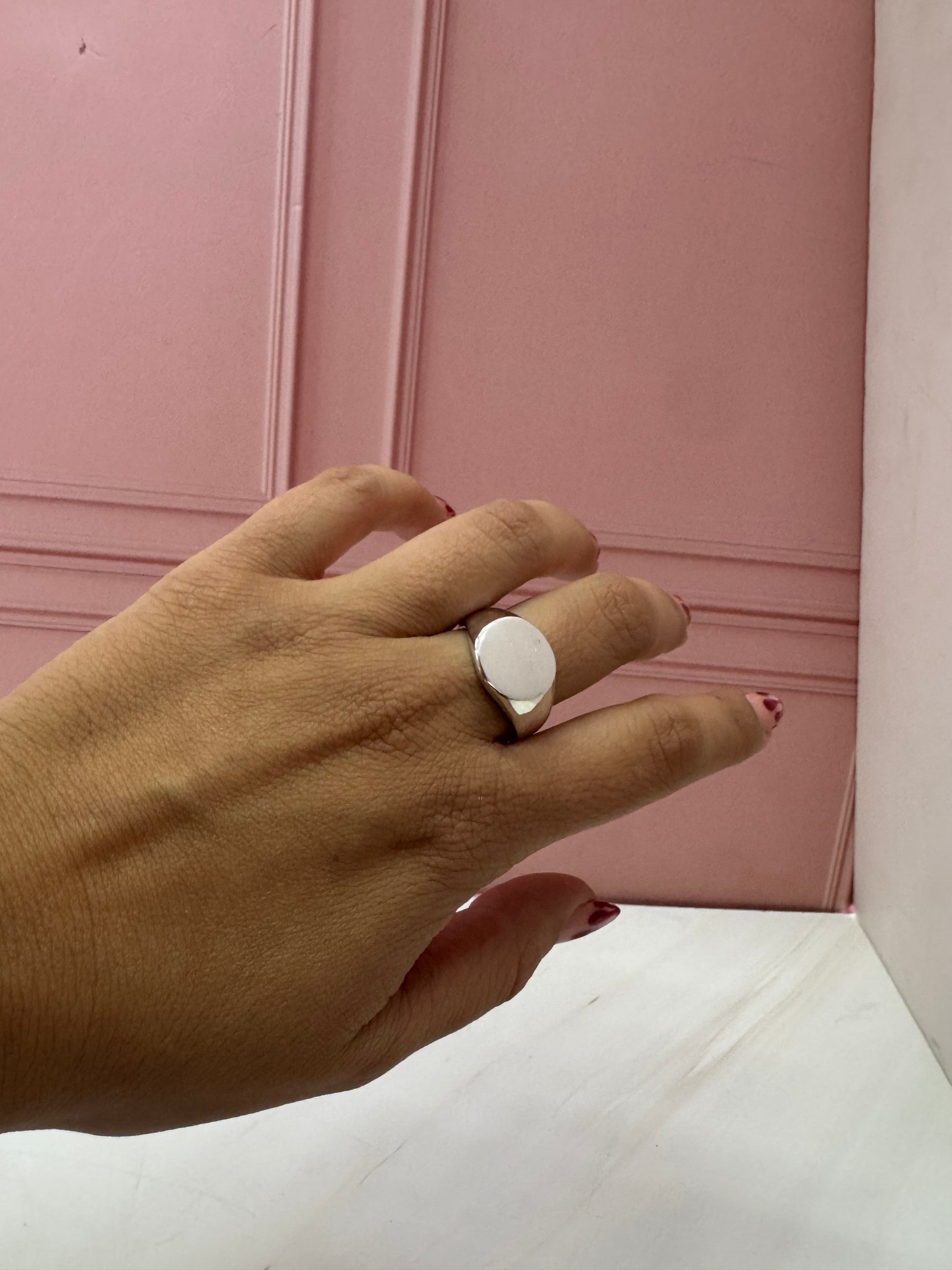 Un anillo sello chunky con placa redonda grande perfecta para personalizar. En plata .925, representa identidad audaz, tradición moderna y la posibilidad de crear tu marca personal con presencia sustancial.