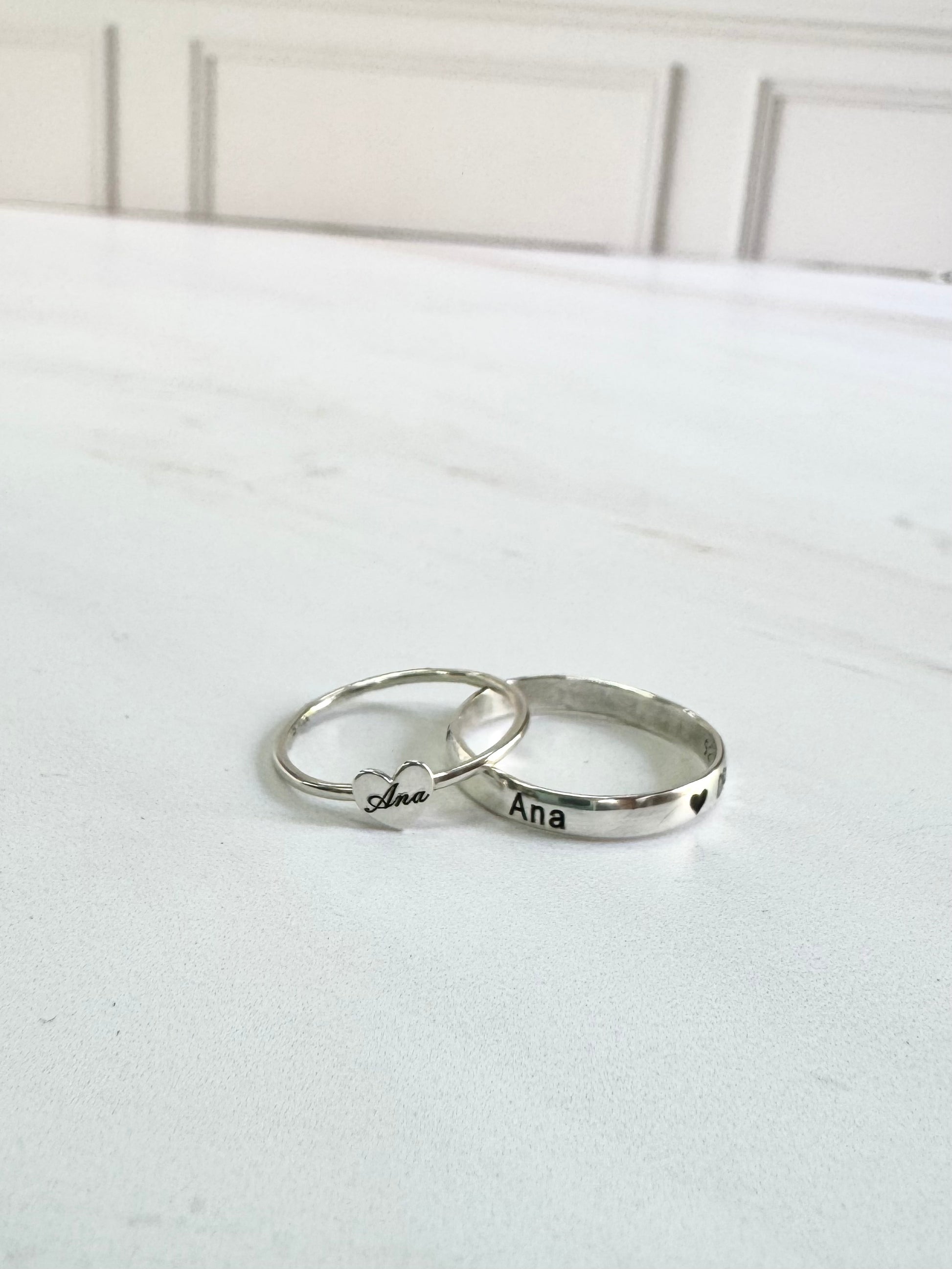Un set especial de anillos personalizados con los datos del bebé. Perfecto para mamá y papá que quieren llevar la información de su bebé siempre con ellos.