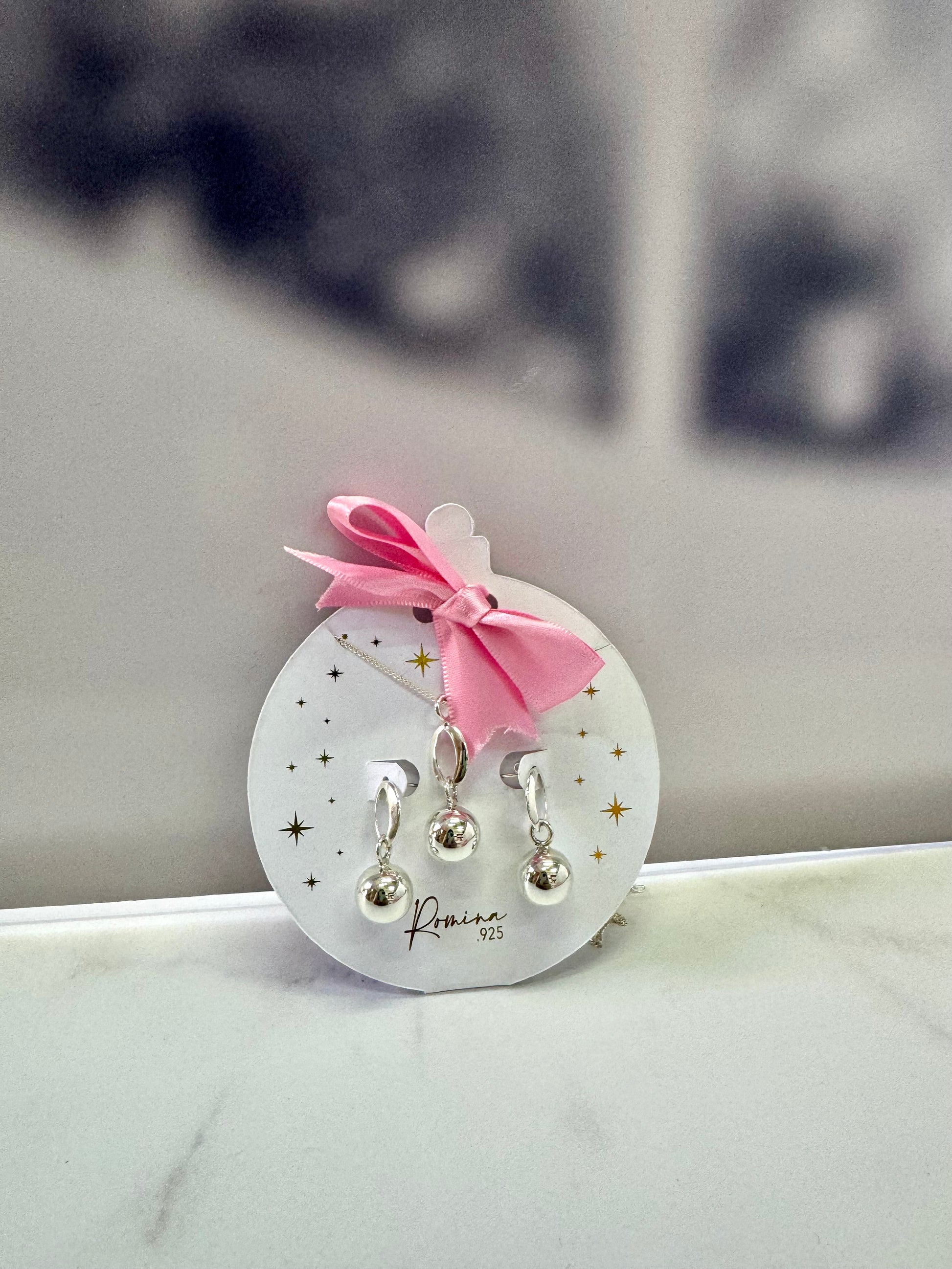 Un set completo y coordinado con aretes, cadena y dije en diseño de esfera lisa. Perfecto para quienes buscan un look elegante y versátil con piezas que combinan a la perfección.