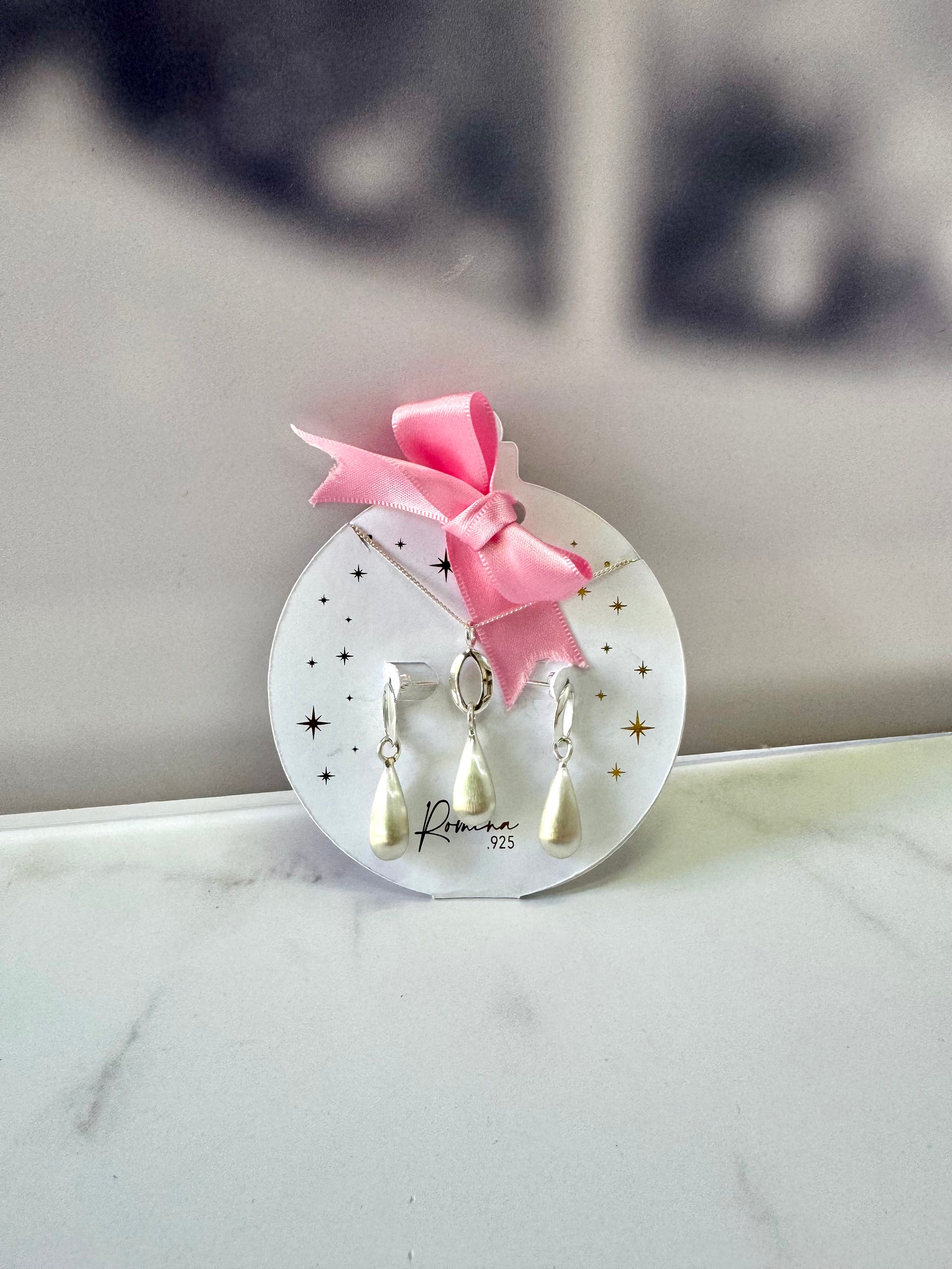 Un set completo y coordinado con aretes, cadena y dije en diseño de gota con acabado mate. Perfecto para quienes buscan un look sofisticado y moderno con piezas que combinan a la perfección.