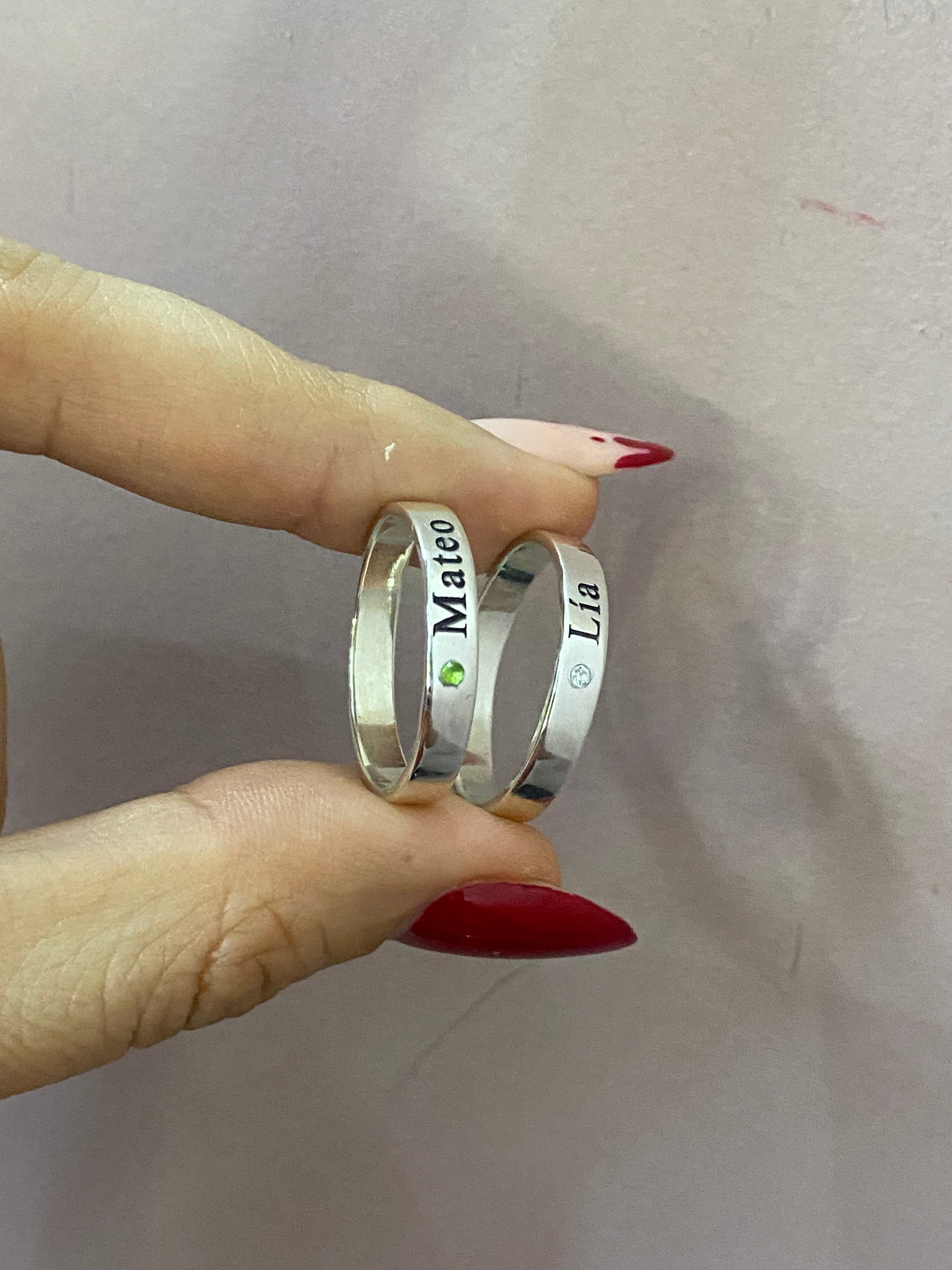Un set de anillos personalizados: uno con piedra de mes de nacimiento y otro con nombre. Perfectos para llevar tu identidad y tu mes especial siempre contigo.