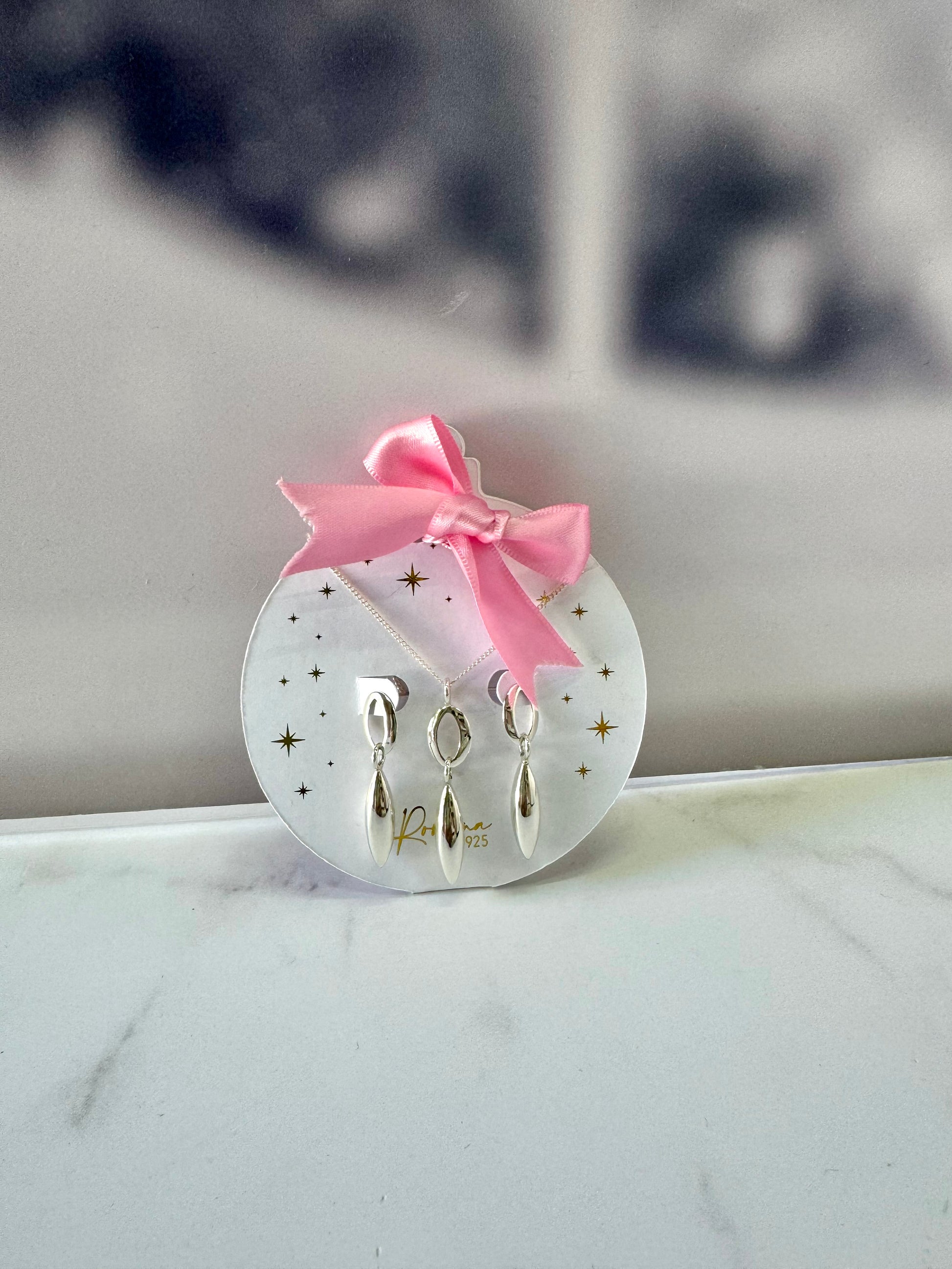 Un set completo y coordinado con aretes, cadena y dije en diseño de semilla liso. Perfecto para quienes buscan un look delicado y elegante con piezas que combinan a la perfección.
