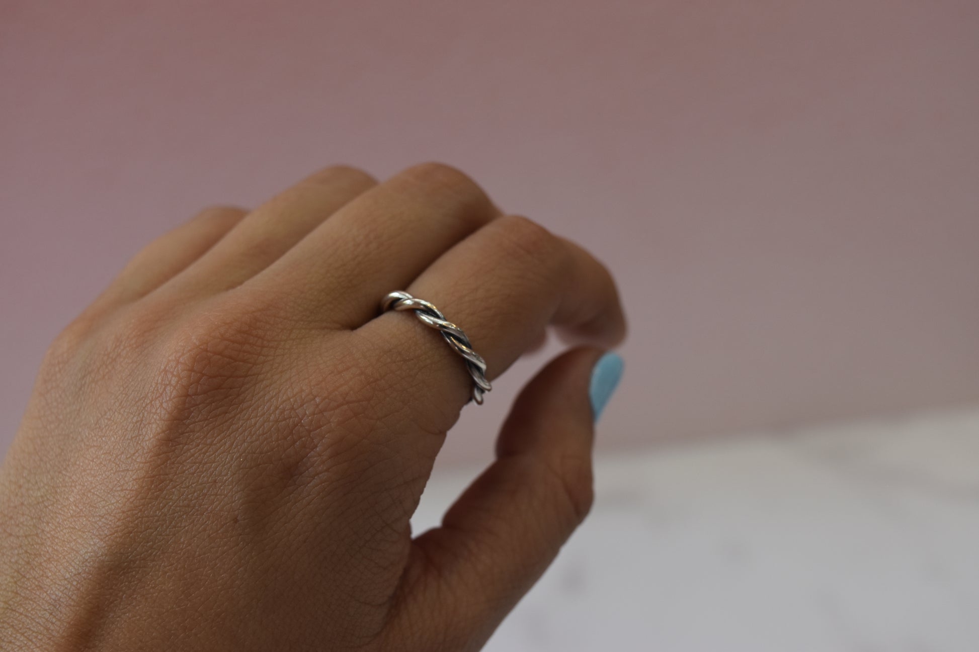 Un anillo elegante con diseño torzal abierto y acabado oxidado. Perfecto para quienes buscan textura vintage con estilo ajustable.