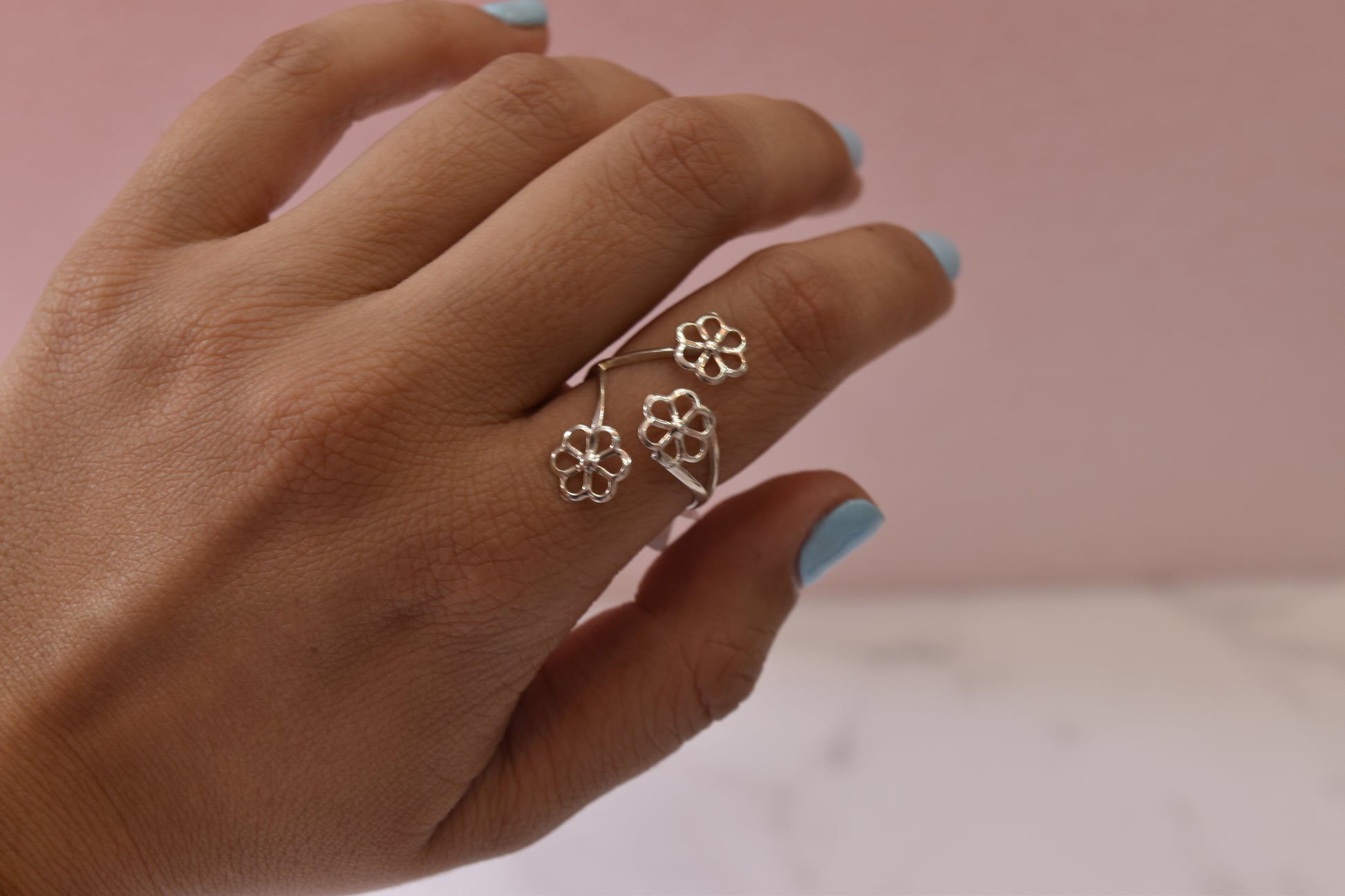 Un anillo hermoso con diseño de triple flor calada ajustable. Perfecto para amantes de las flores que buscan un diseño delicado con ajuste perfecto.