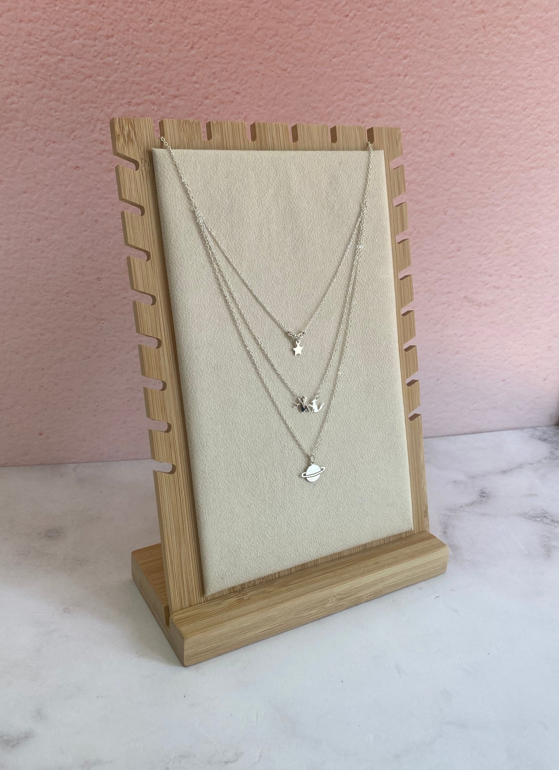 Un collar inspirado en las enseñanzas del Principito. Tres dijes en plata .925 representan las lecciones más importantes: lo esencial es invisible a los ojos, eres responsable de lo que amas, y cada estrella es única.